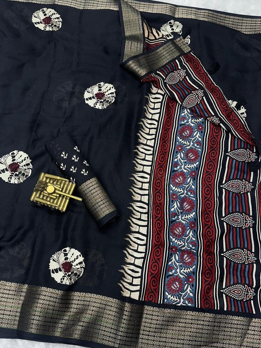Look effortlessly elegant in our Digital Printed Dola Silk Saree! Crafted from lightweight and breathable silk fabric, this saree is comfortable to wear all day long. The vivid digital print design gives a contemporary twist to the classic dola silk, making it a must-have in your wardrobe.