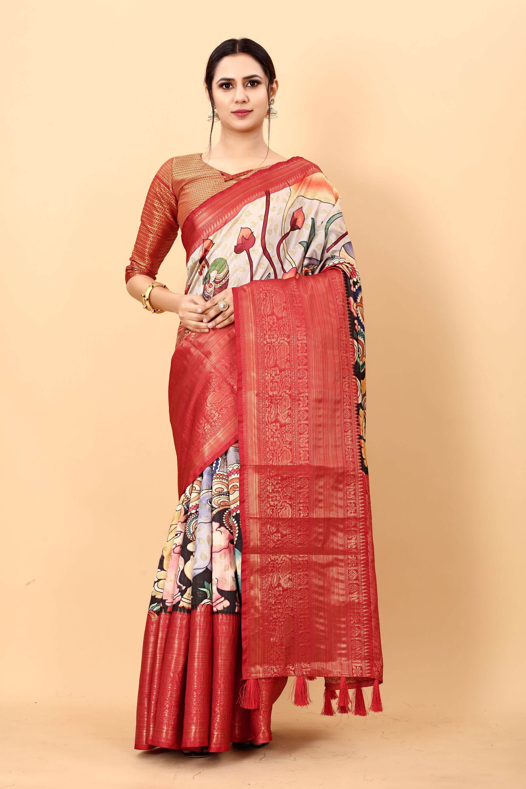 Panoply Beige Kalamkari Printed Saree With Eloquence Blouse Piece