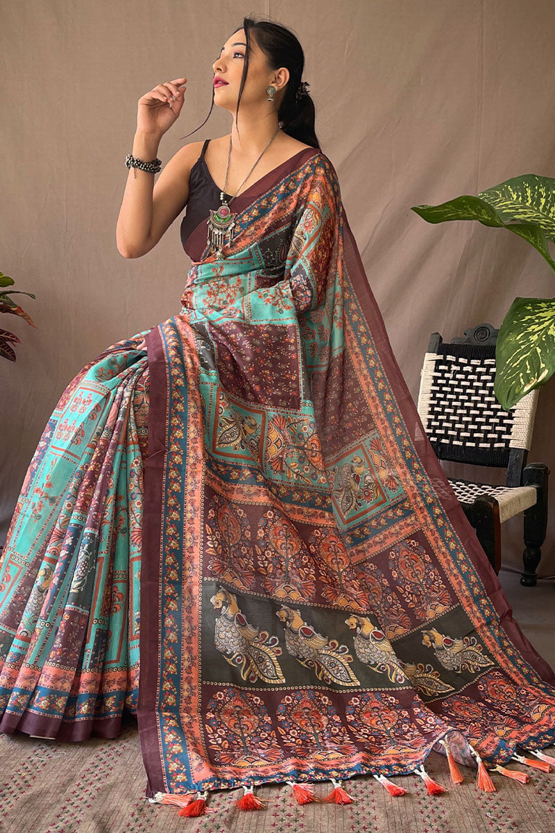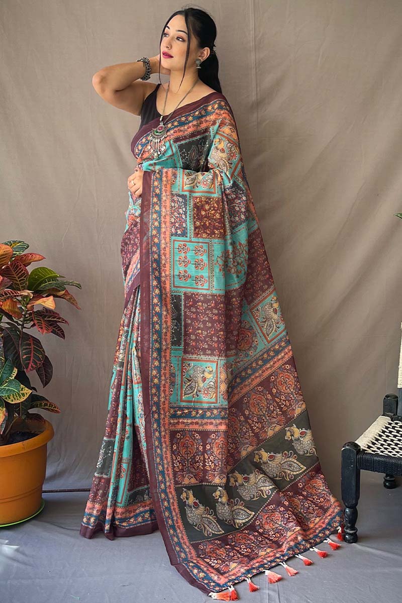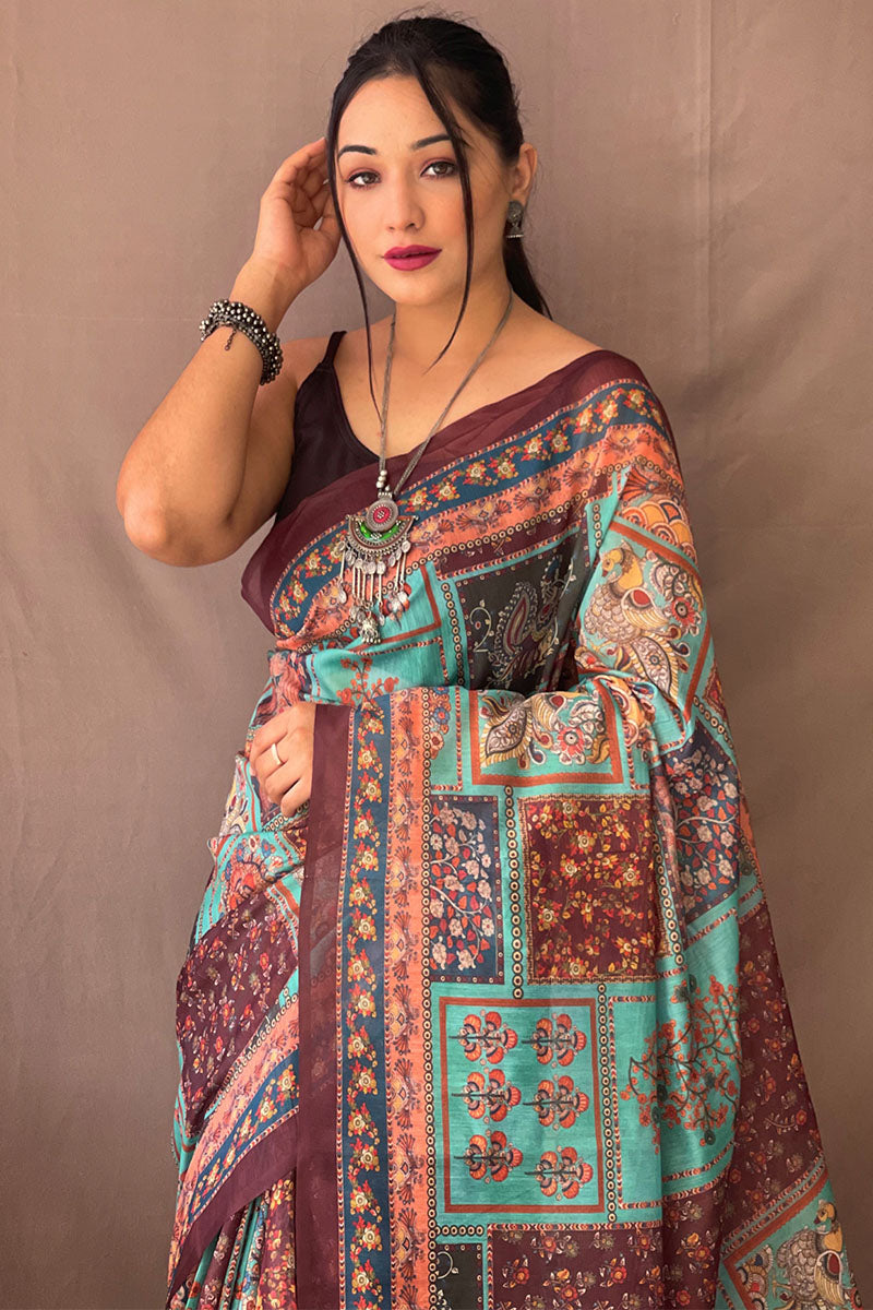 Piquant Firozi Kalamkari Printed Saree With Rhapsody Blouse Piece