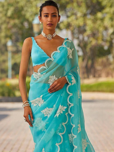 The blouse worn by the model might be for modelling purpose only. Check the image of the blouse piece to understand how the actual blouse piece looks like.