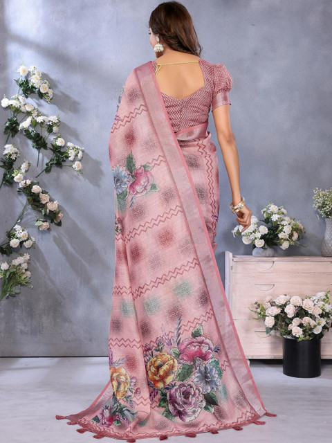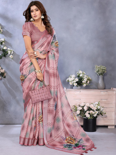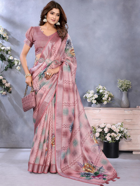Mameraa Floral Printed Zari Saree With Unstitched Blouse