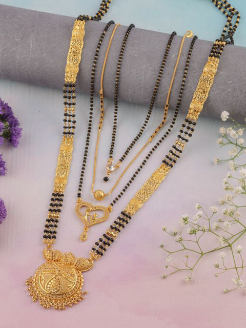 Mameraa Set of 4 Gold-Plated Stones Studded and Beaded Long & Short Mangalsutras