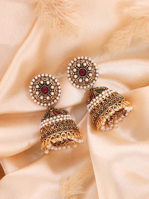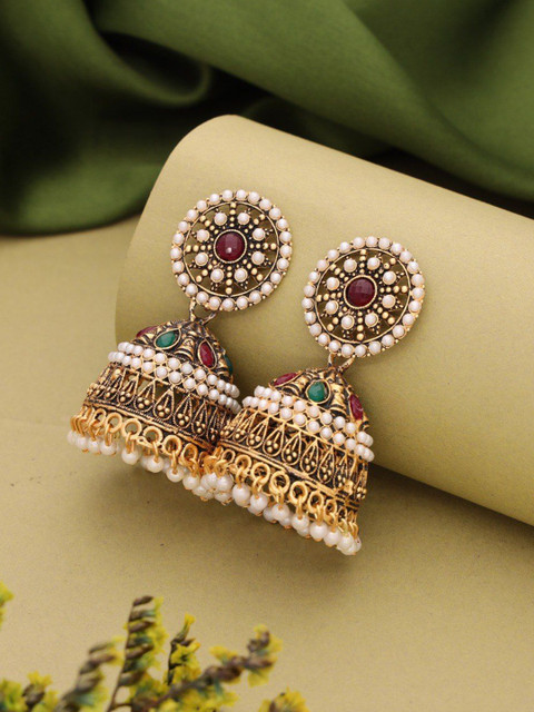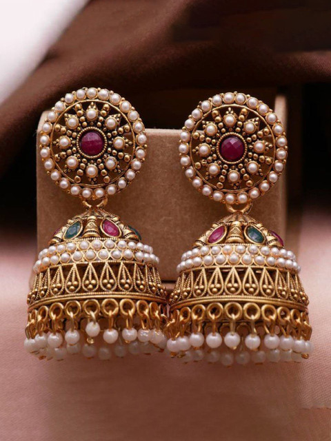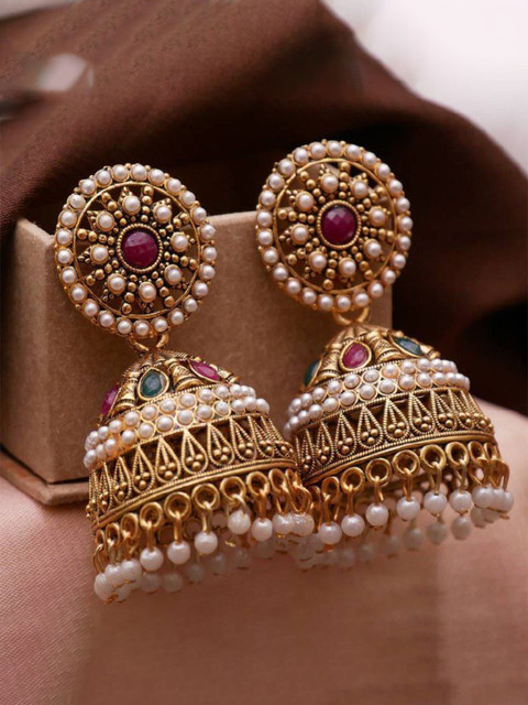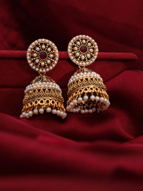 Mameraa Gold Plated Artificial Stones Studded And Beaded Dome Shaped Jhumkas