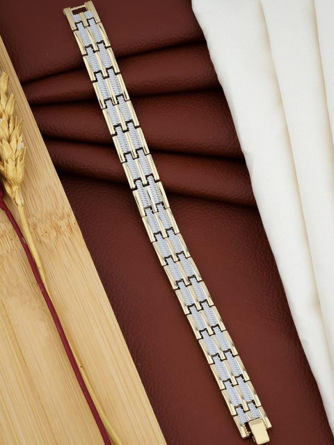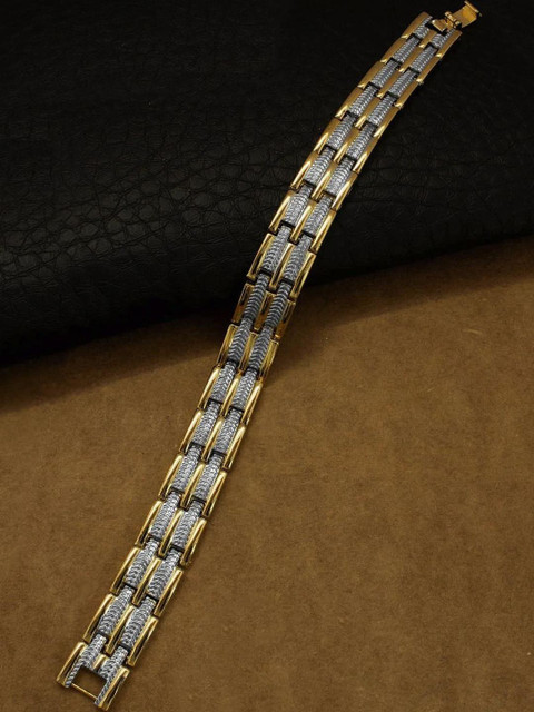 Roadster men's bracelet showcases a distinctive design with alternating links of polished gold and silver-toned metal, likely gold plating and rhodium plating, The silver-toned links feature a textured inlay,bracelet has a substantial feel and a secure clasp, ensuring comfortable and reliable wear, making this Roadster bracelet a stylish accessory for men