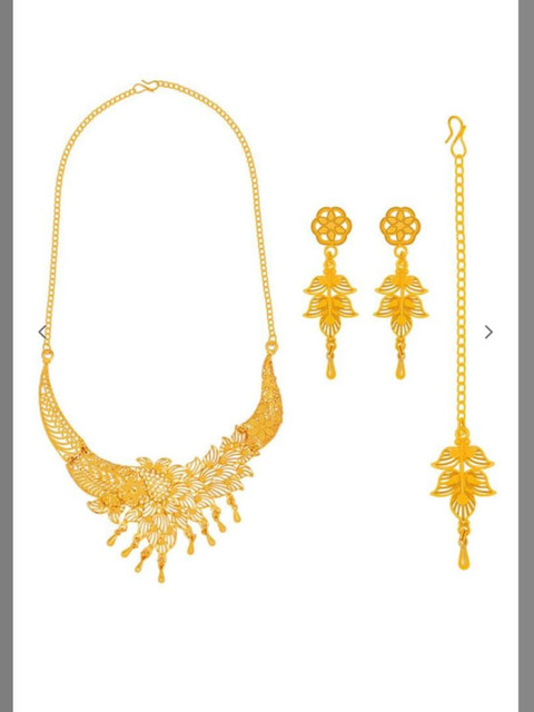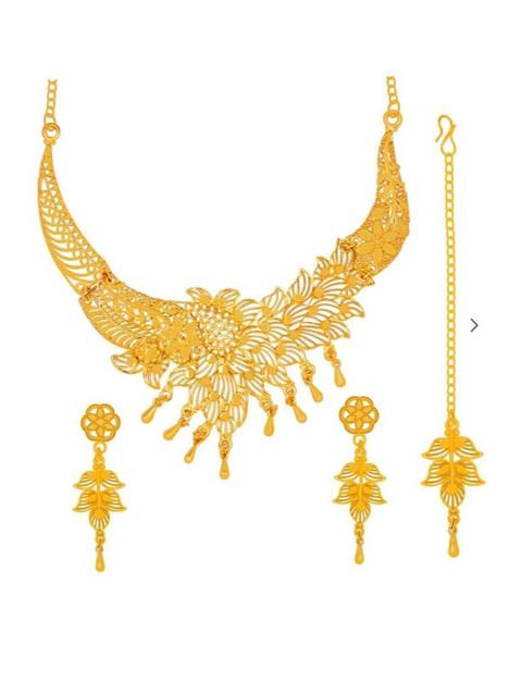 The entire set boasts a rich, antique gold-plated finish, giving it the authentic look and feel of traditional temple jewellery.
