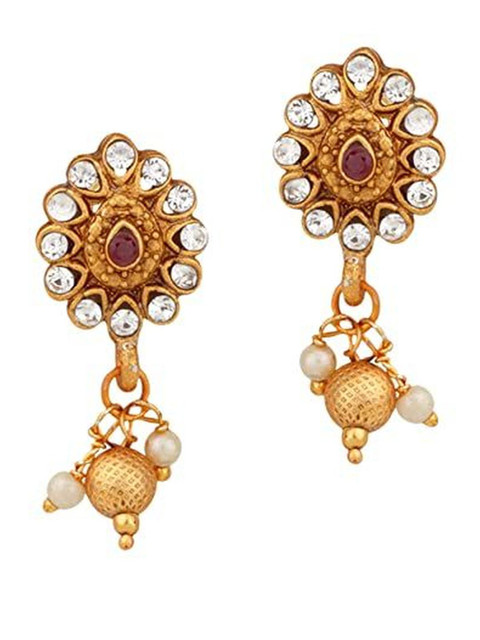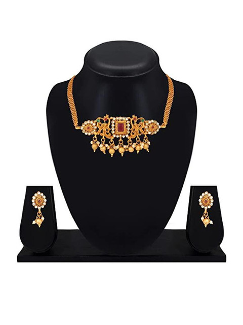 Mameraa Ruby Red Beaded Gold-Toned Necklace Set with Intricate Pendant & Earrings