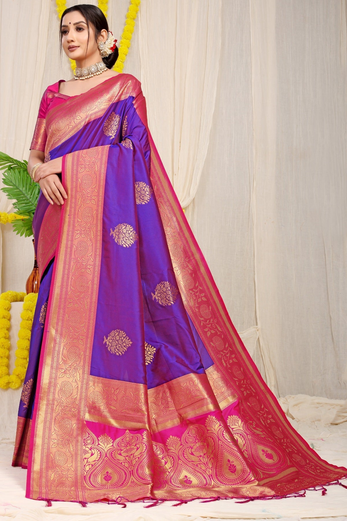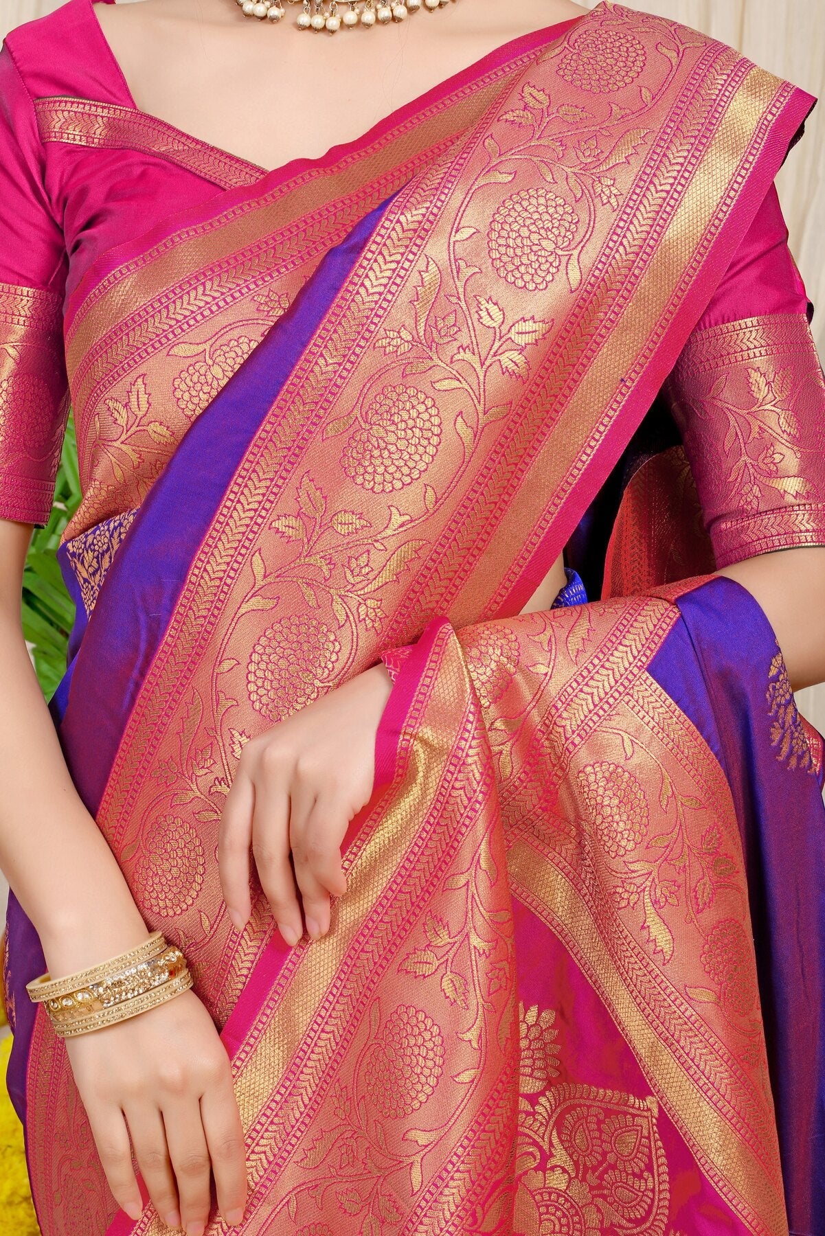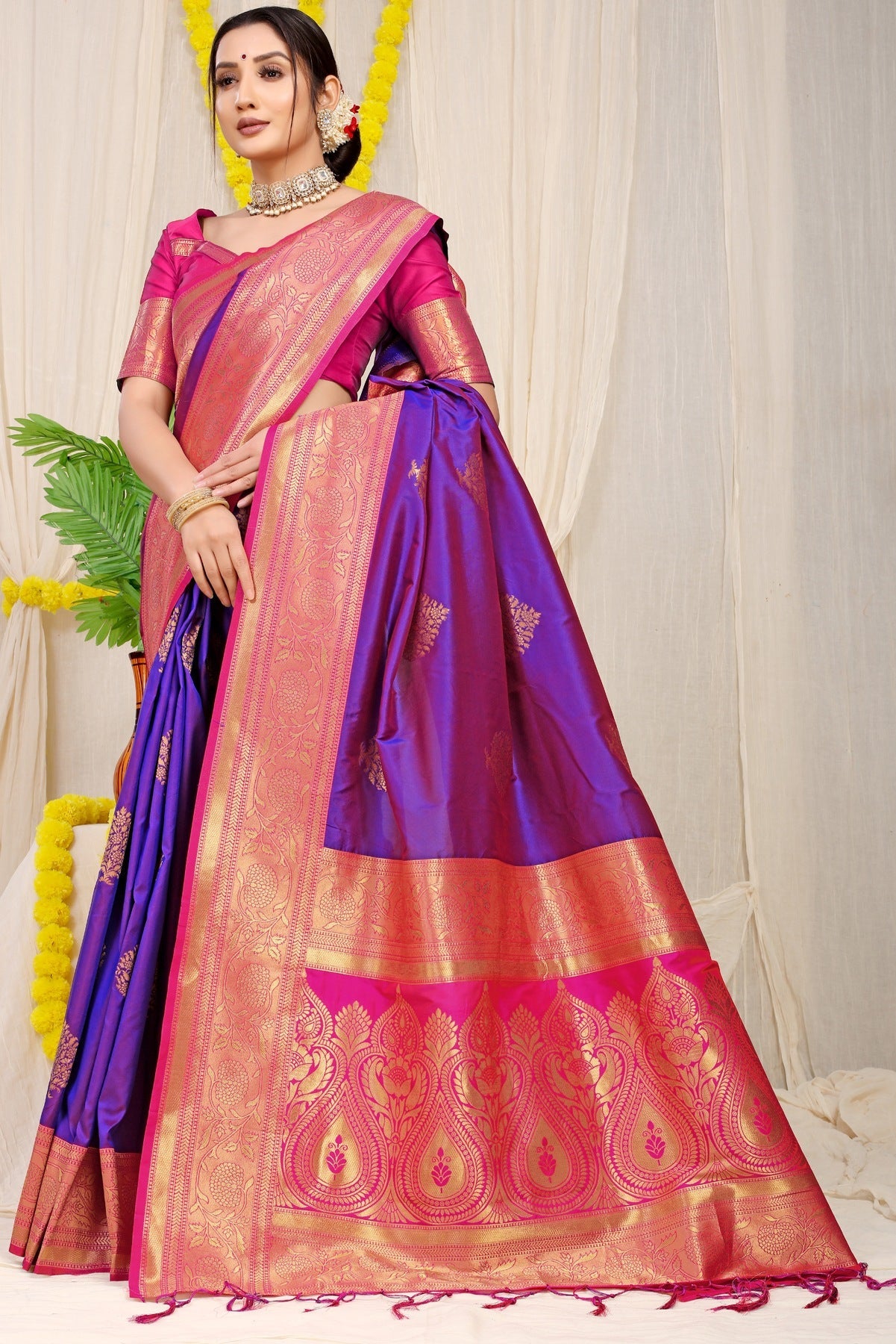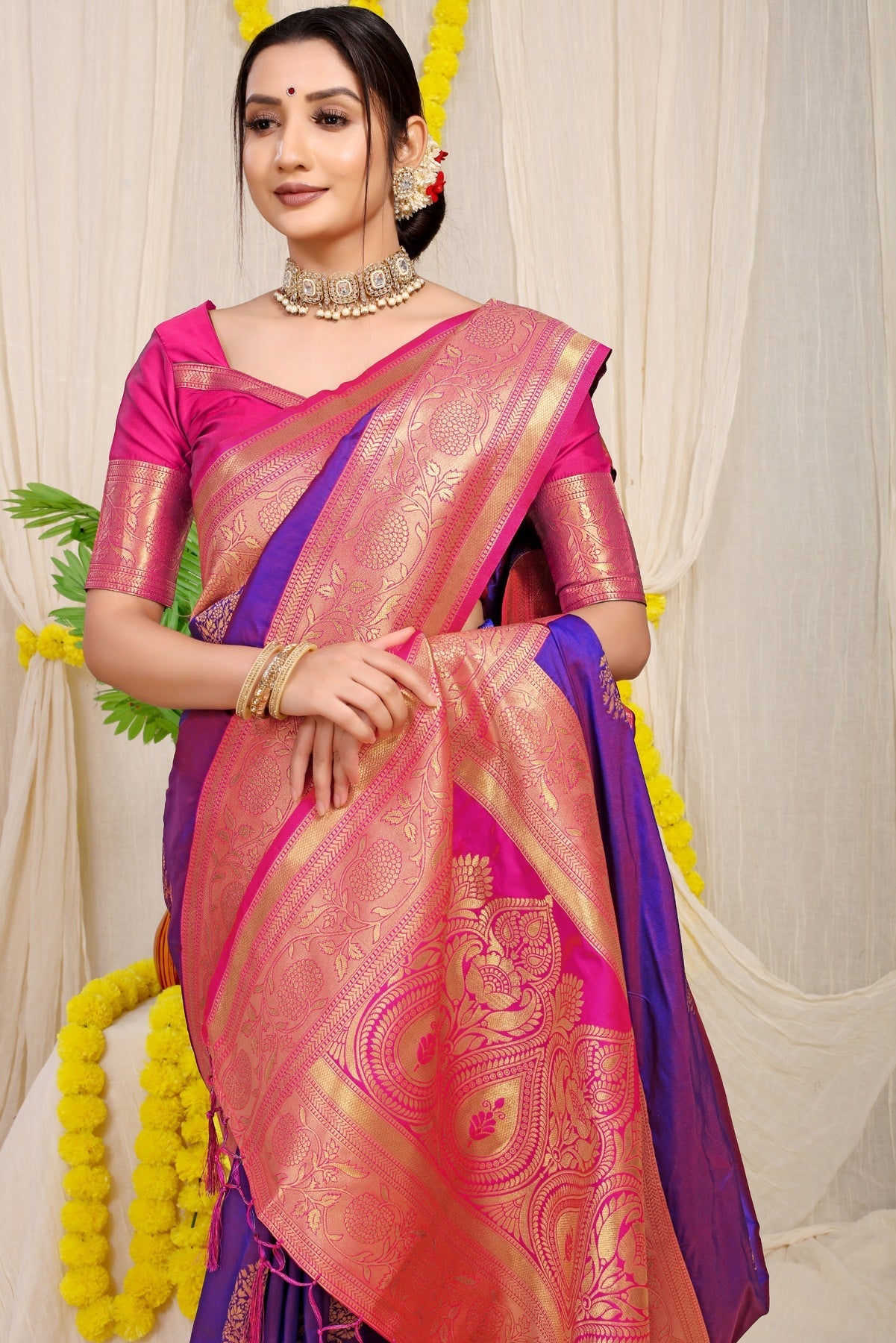 Beautiful Purple Banarasi Silk Saree With Forbearance Blouse Piece