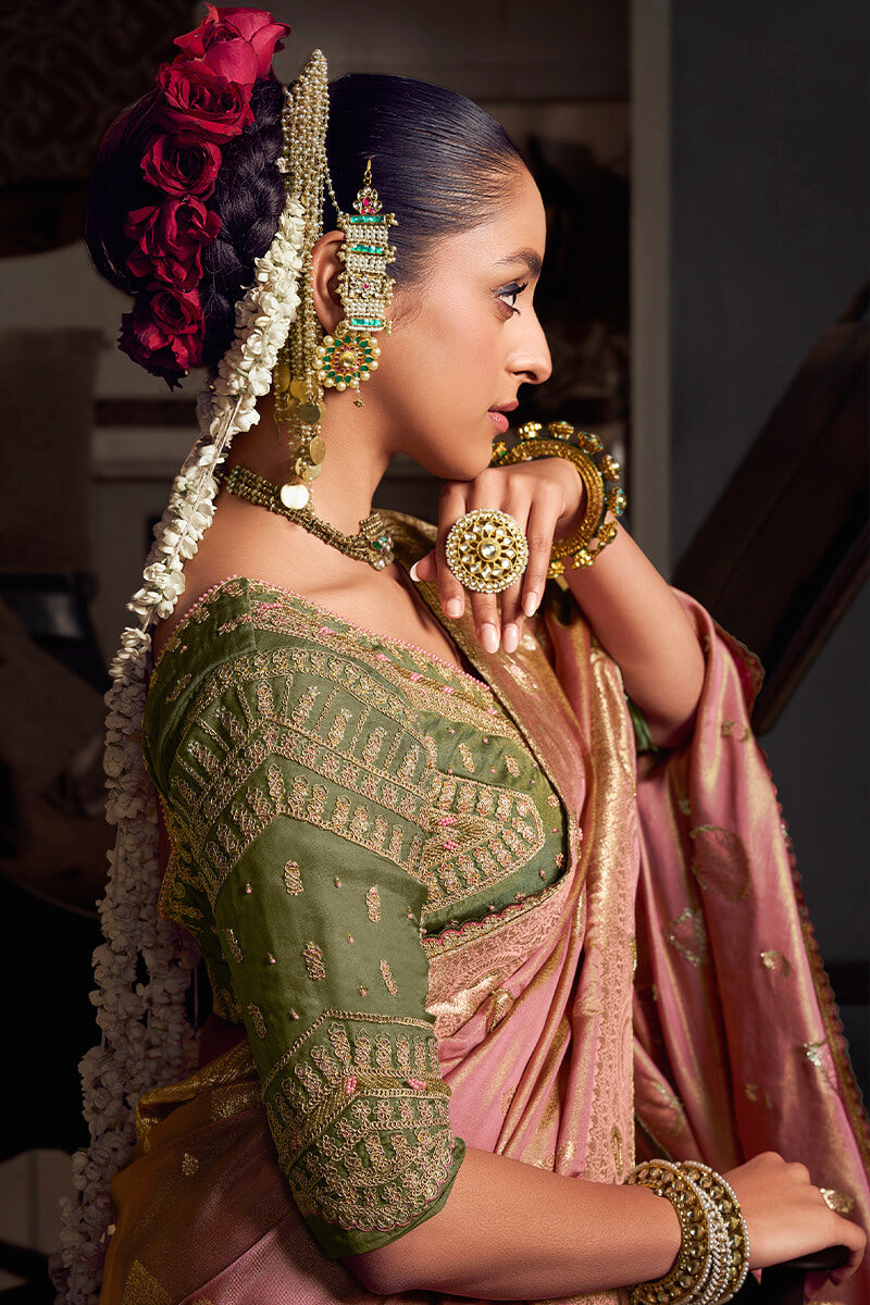 Bewitching Pink Pure Viscose Tissue Banrasi Silk Saree With Brood Blouse Piece
