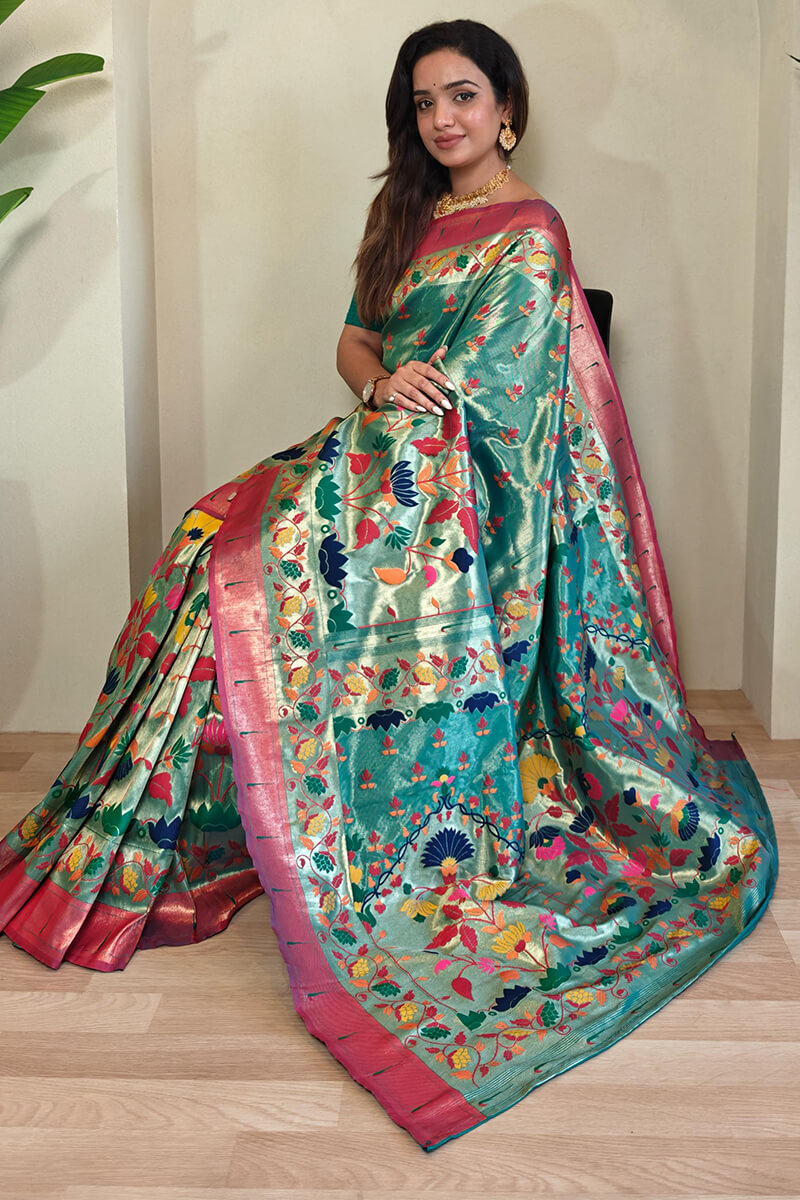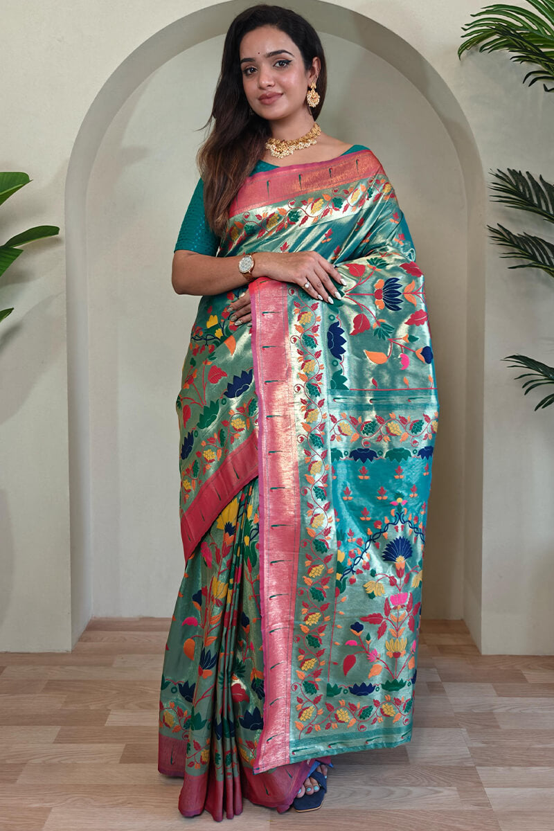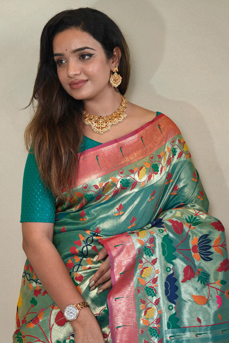 Experience the allure of the Paithani Silk Saree, a sartorial marvel that captures the essence of Indian heritage and beauty. Meticulously handcrafted with sumptuous silk threads and intricate detailing, this saree radiates grace and elegance.