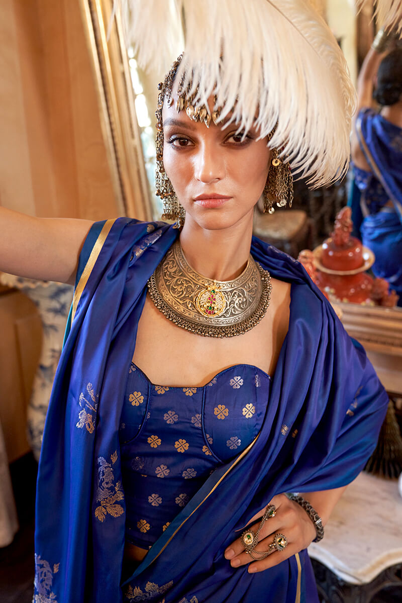 Charming Royal Blue Banarasi Satin Silk Saree With Adorning Blouse