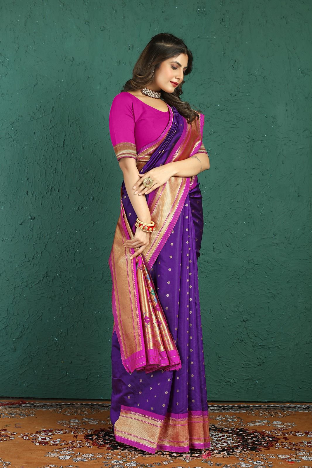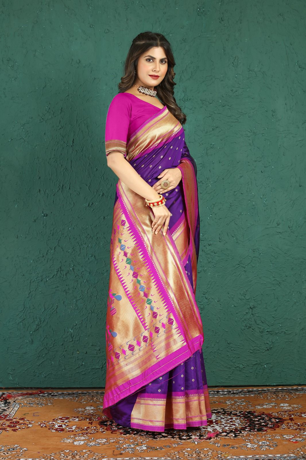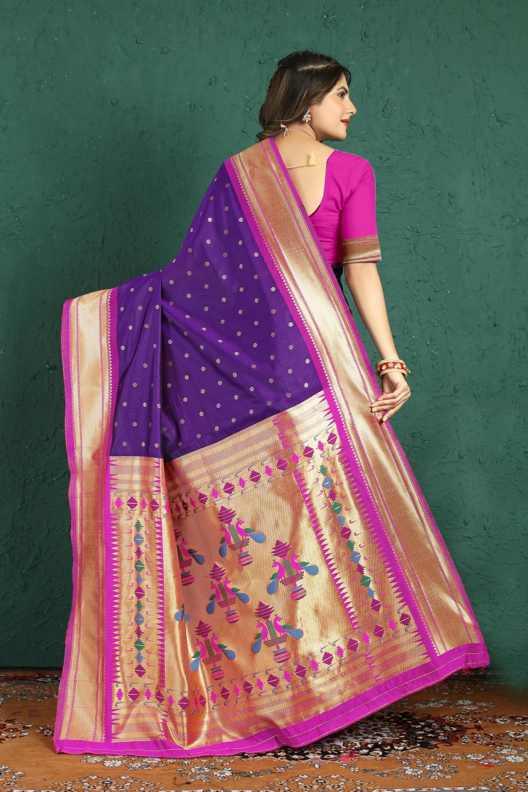 The Paithani silk saree is adorned with opulent motifs and intricate designs inspired by nature, culture, and traditional craftsmanship. Each thread is meticulously handwoven, ensuring a mesmerizing symphony of colors and patterns that reflect the rich heritage of Maharashtra.