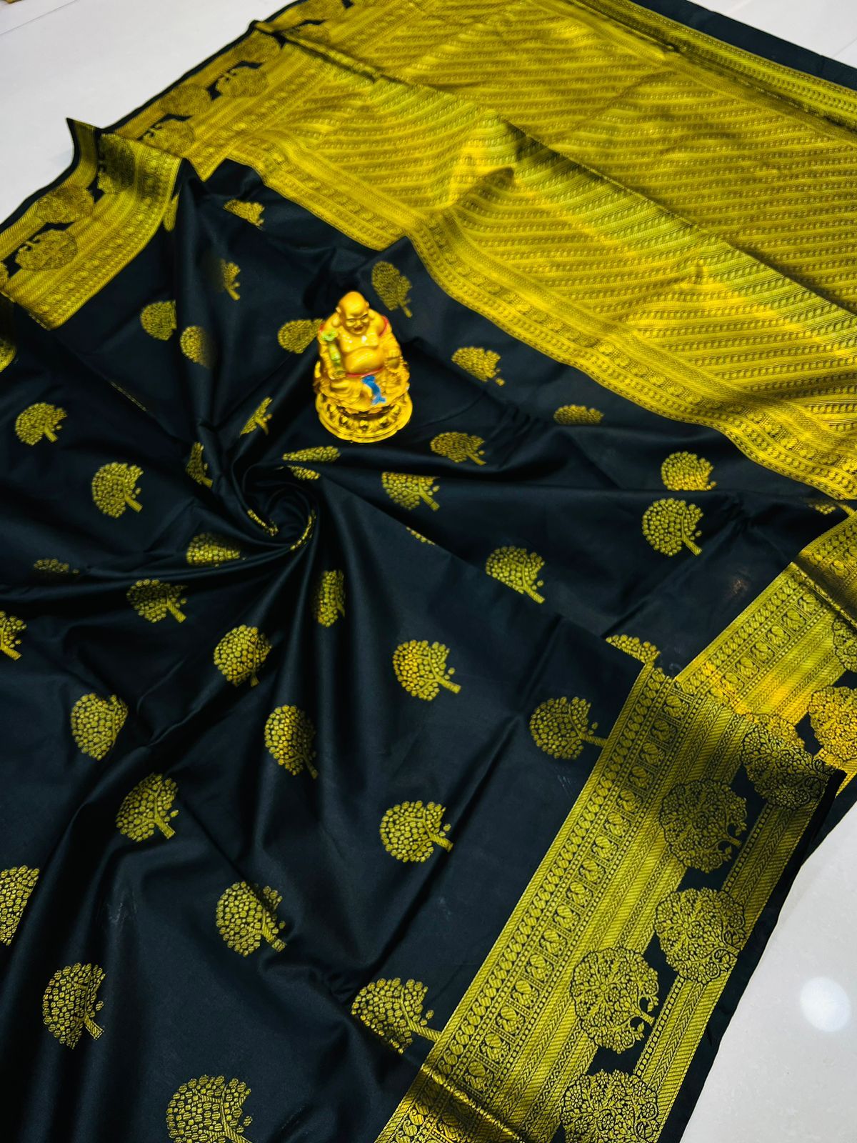 You will find it hard to say no to the resplendent appeal of the colour combination and to the dancing motif in pure Banarasi silk saree which is like a match made in heaven and has a magical powers to make you look like a royalty in seconds.