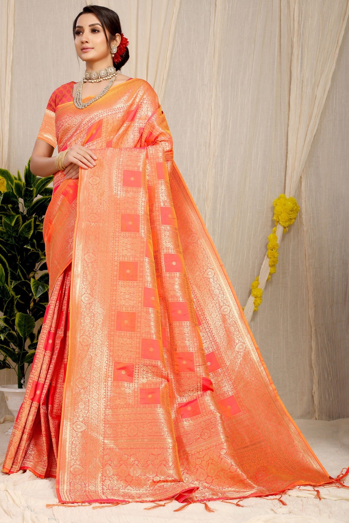 An opulence of vivid colors and lush gold, here comes our Handloom weaving Kanjivaram silk saree collection from South India. These saris hold a special name for their intricate designing work embellished with golden threads and borders. This sparkling piece comes in shades of gold to brighten up your wardrobe and gift you a timeless charm.