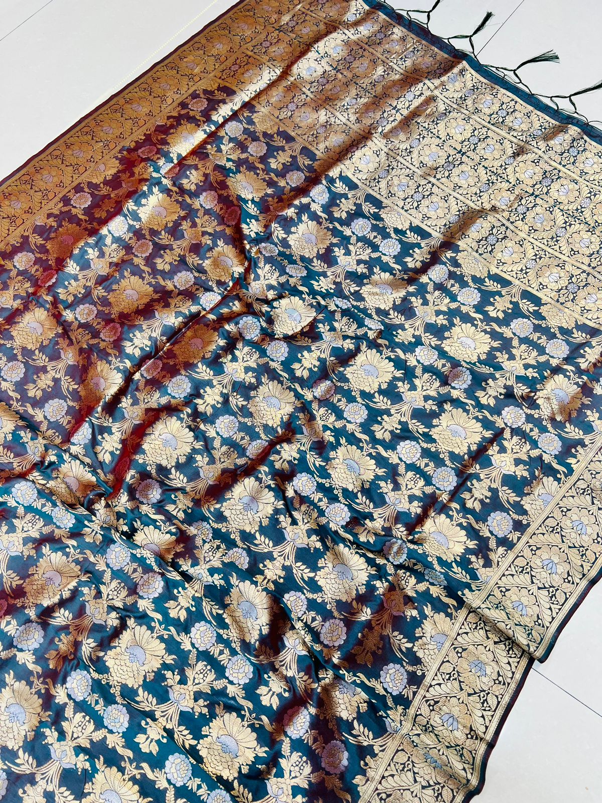 Dazzling Rama Banarasi Silk Saree With Fairytale Blouse Piece
