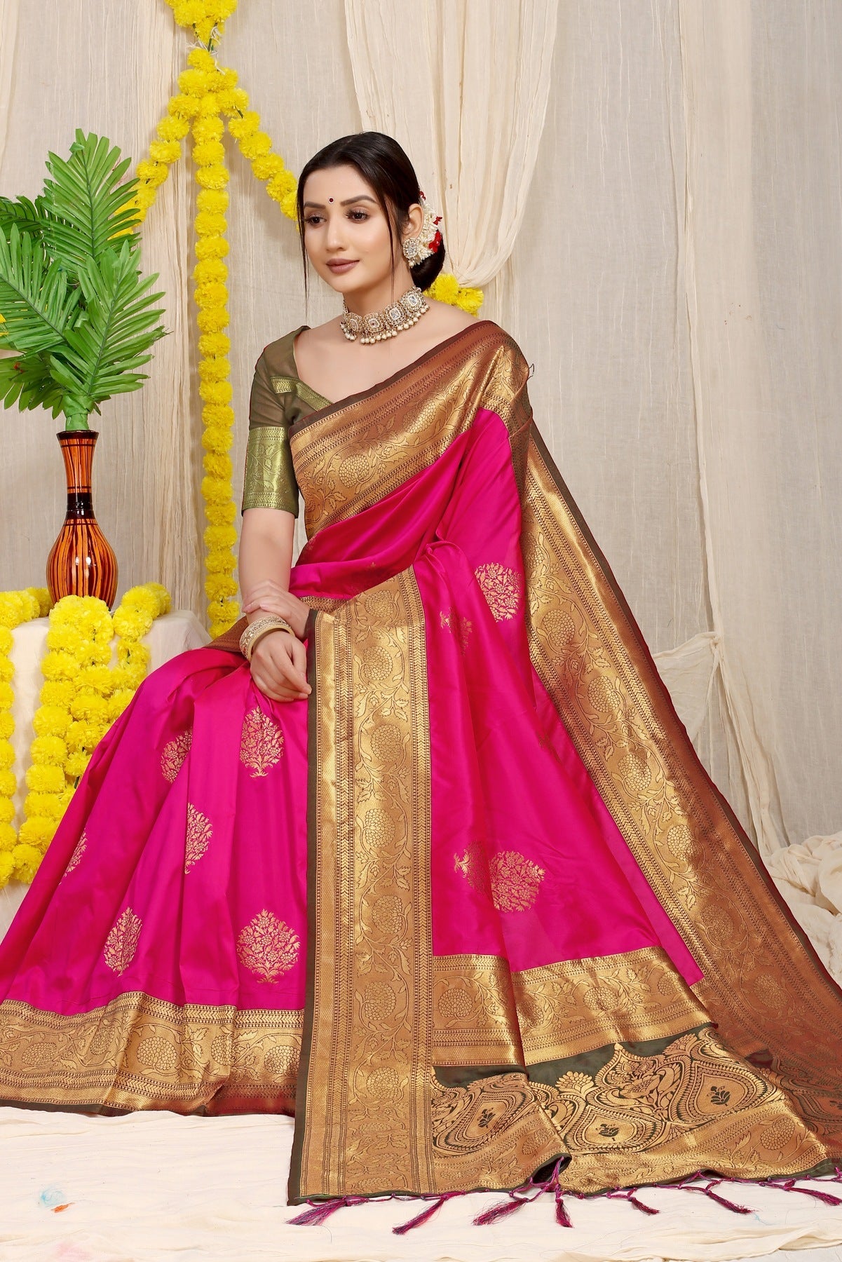 Bringing the best of the traditions on a saree, this piece is composed of poise and elegance. With carefully selected designs and rich border, no wardrobe is complete without this saree.