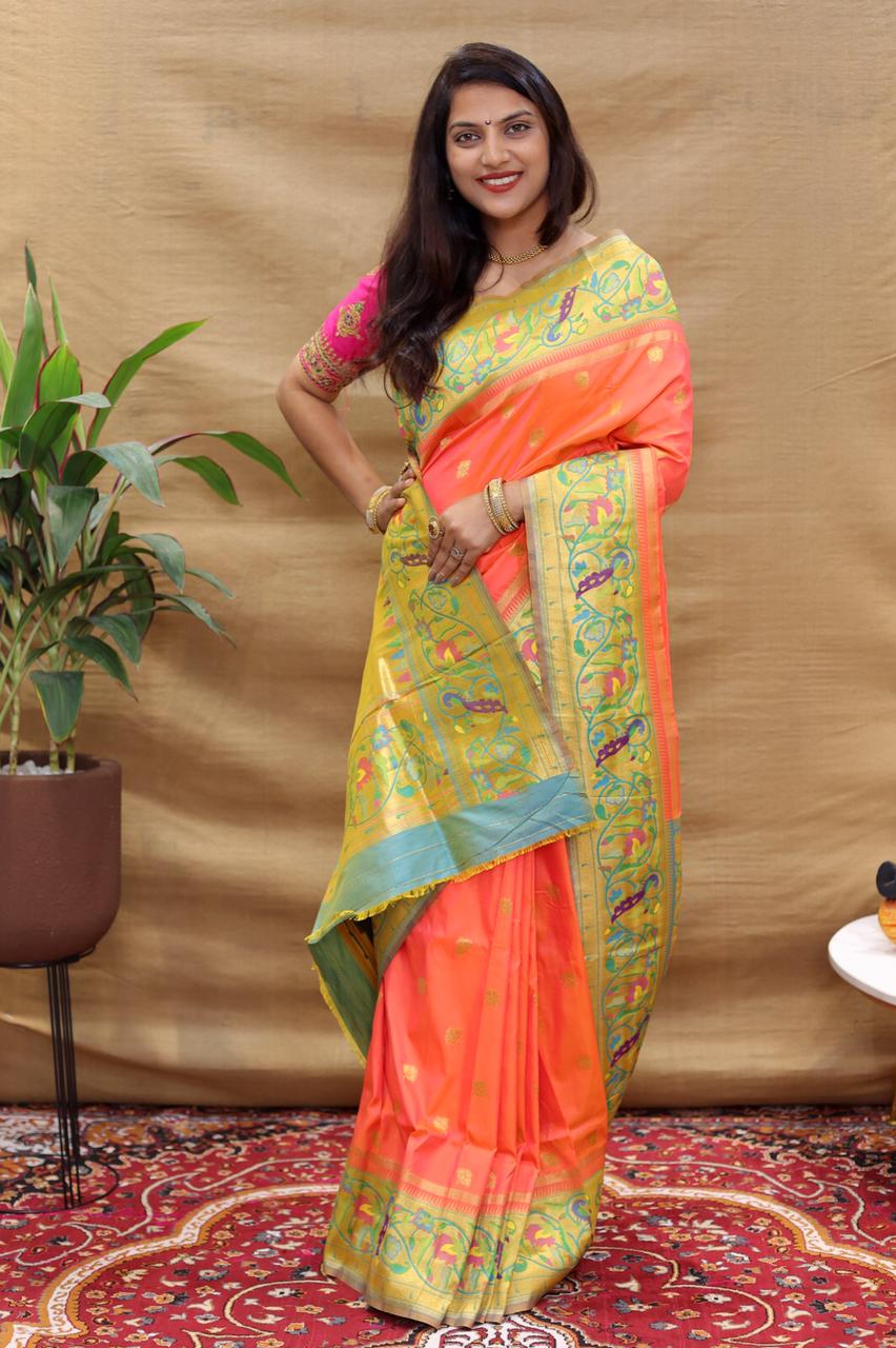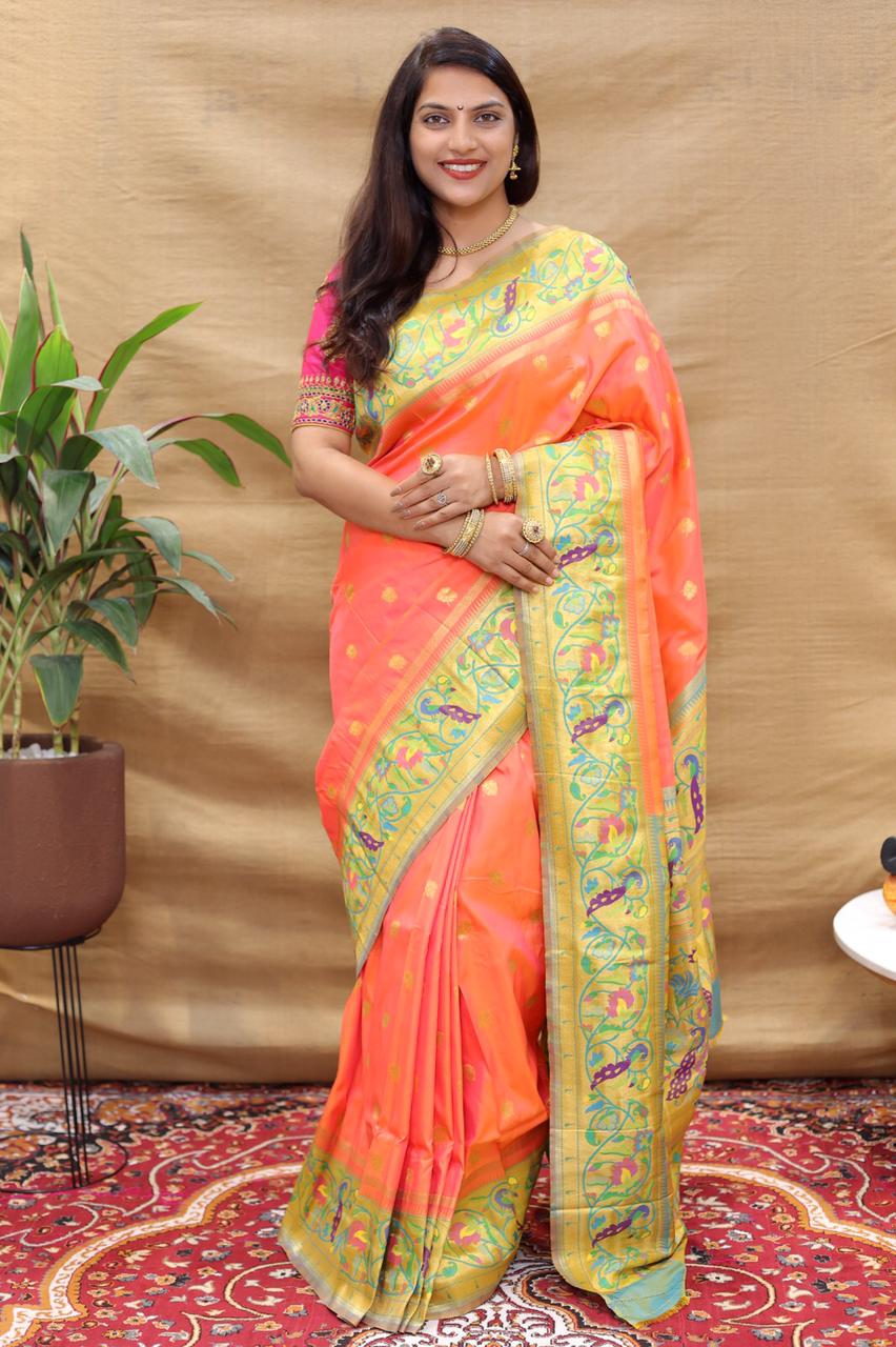 Demesne Peach Paithani Silk Saree With Forbearance Blouse Piece