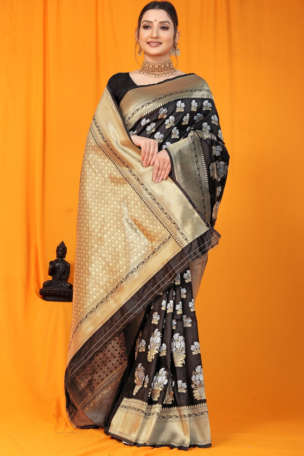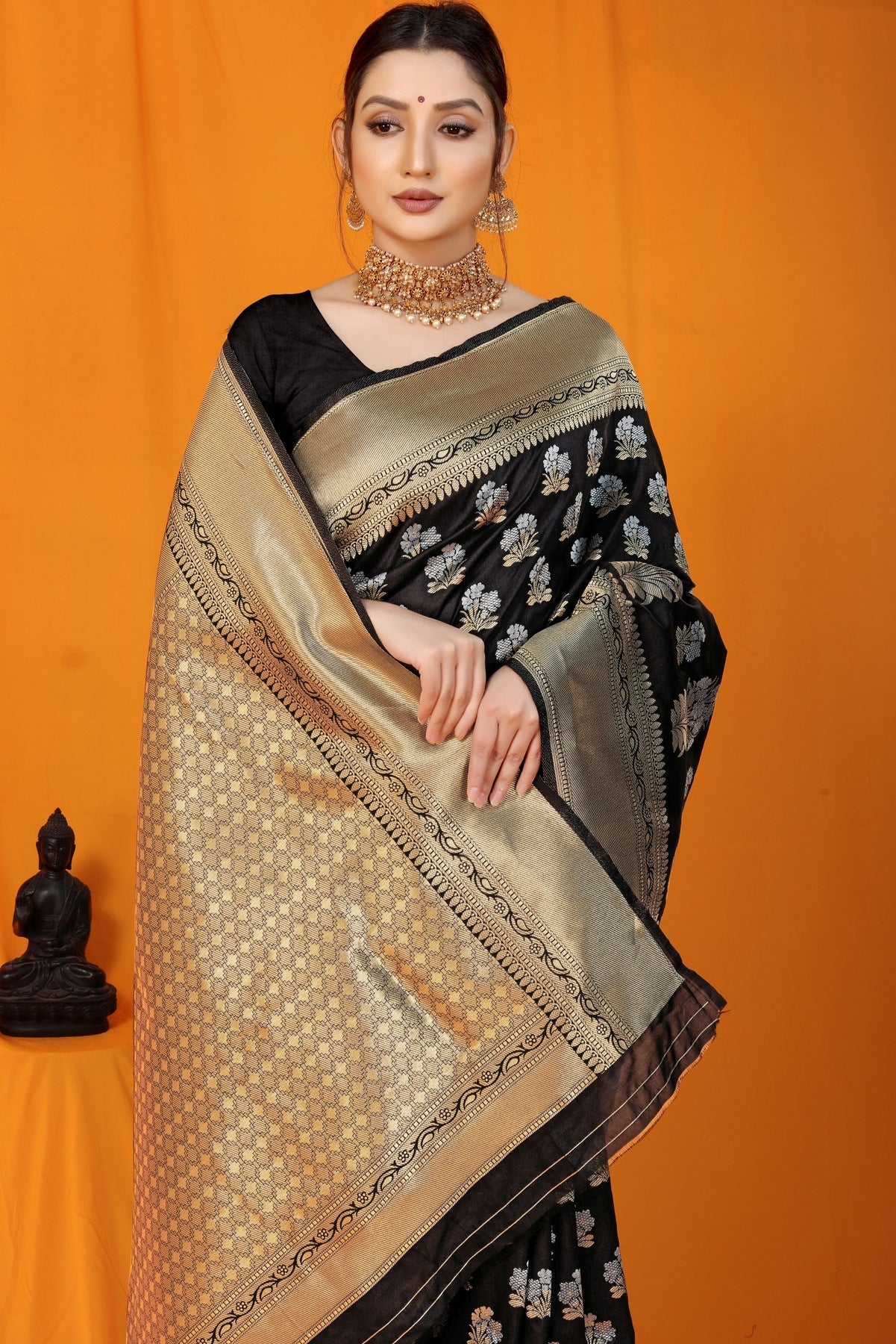 BLOUSE SPECIFICATION: Fabric: Kanjivaram Silk Colour: Black Work Type: Jacquard Weaving Stitching Type: Unstitched