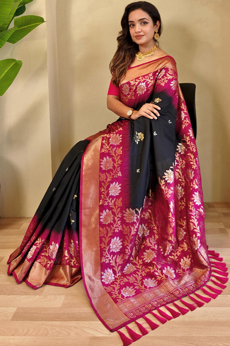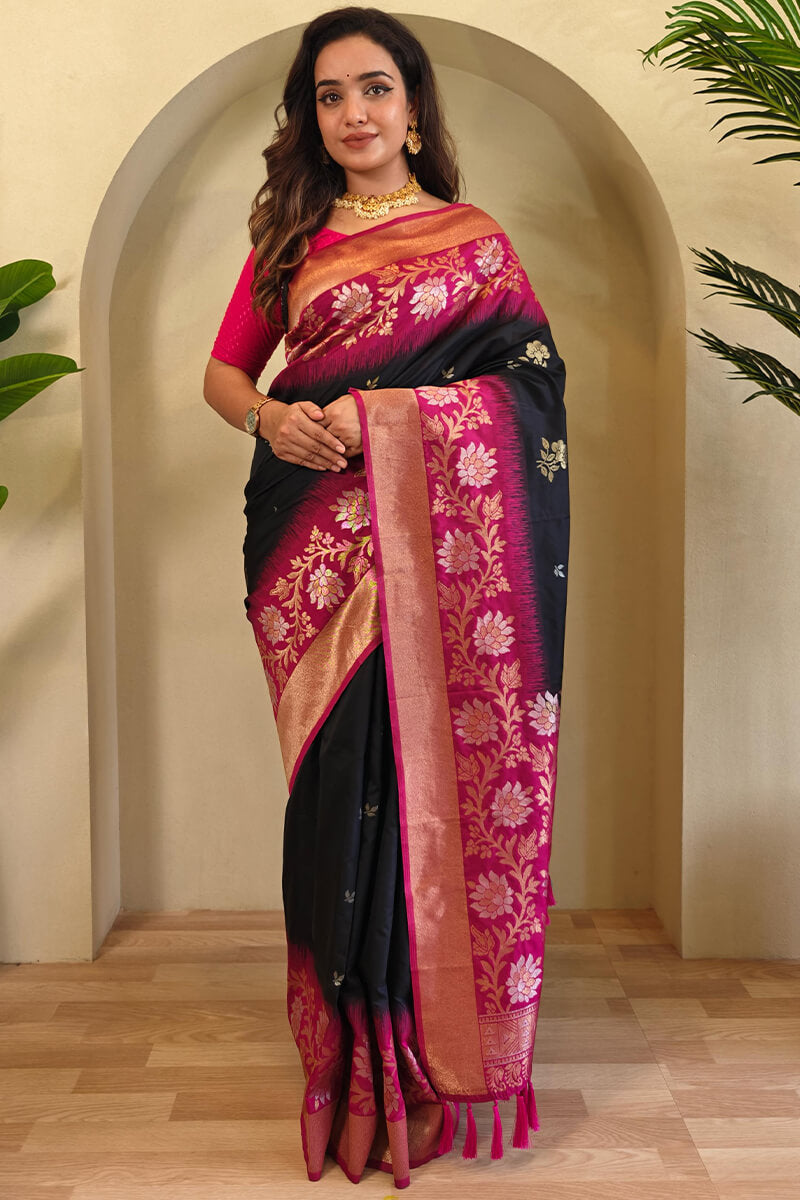 Desirable Black Soft Banarasi Silk Saree With Ephemeral Blouse Piece