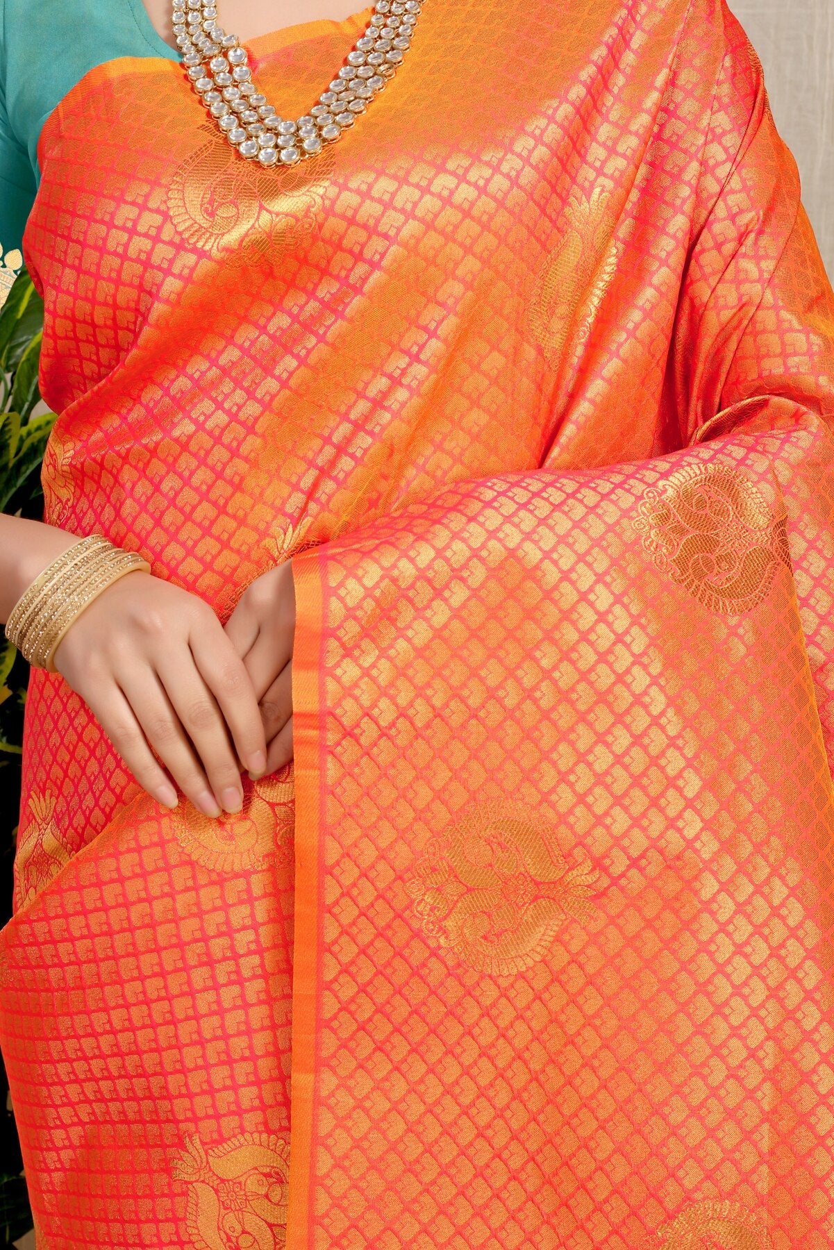 Embodying a charismatic design, this alluring soft silk saree gracefully blends tradition and couture. Soaked in the traditional heritage of South India, Kanjivaram Saree Designed in one of the most superior silk fabrics in the world, this will be a perfect grand pick for all your momentous events.
