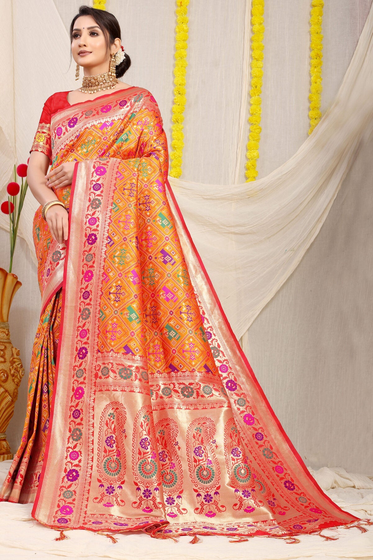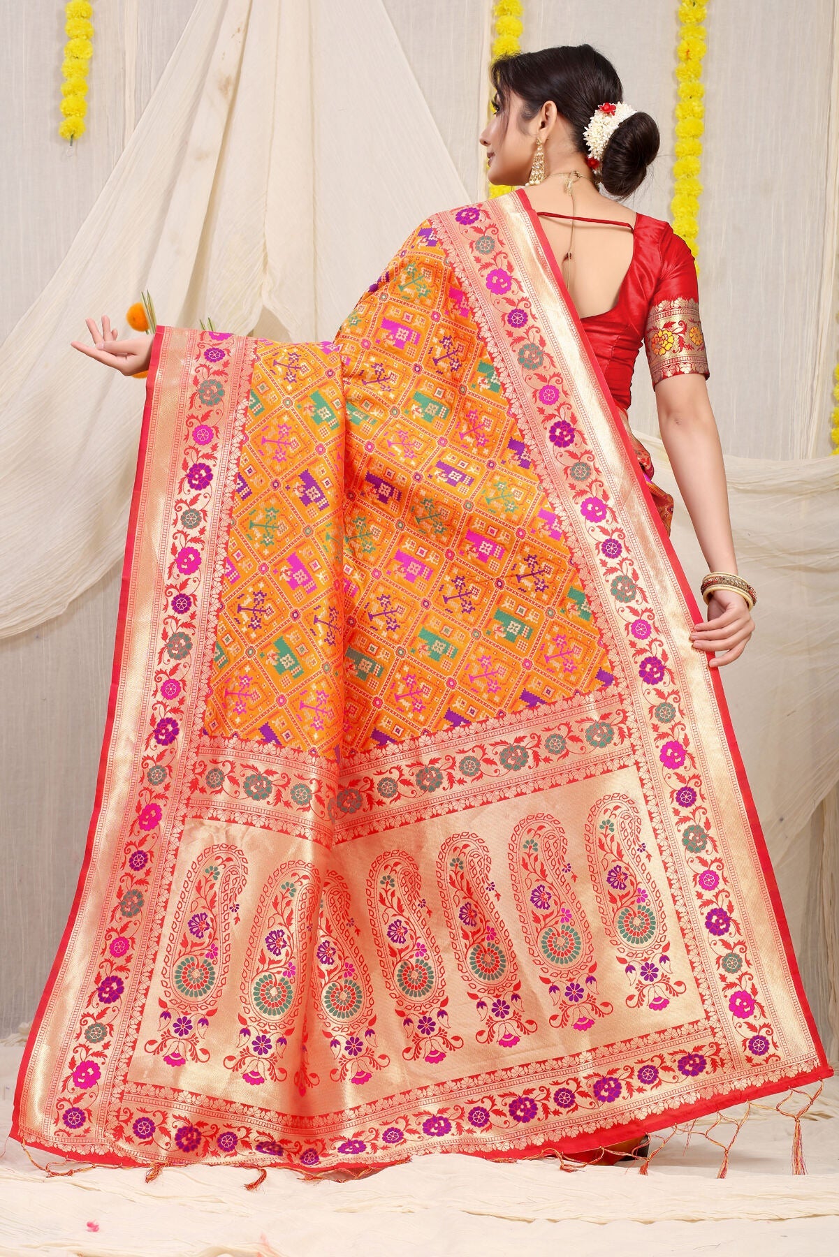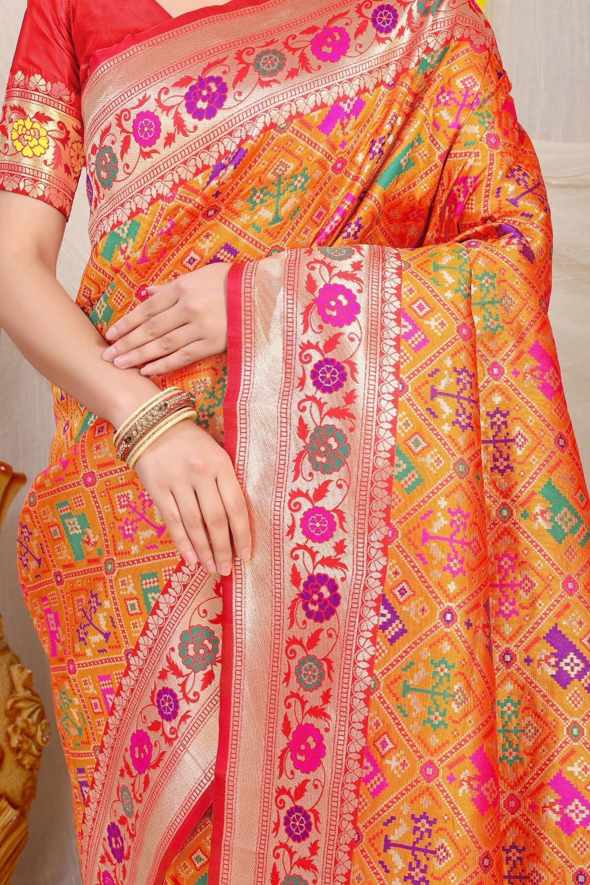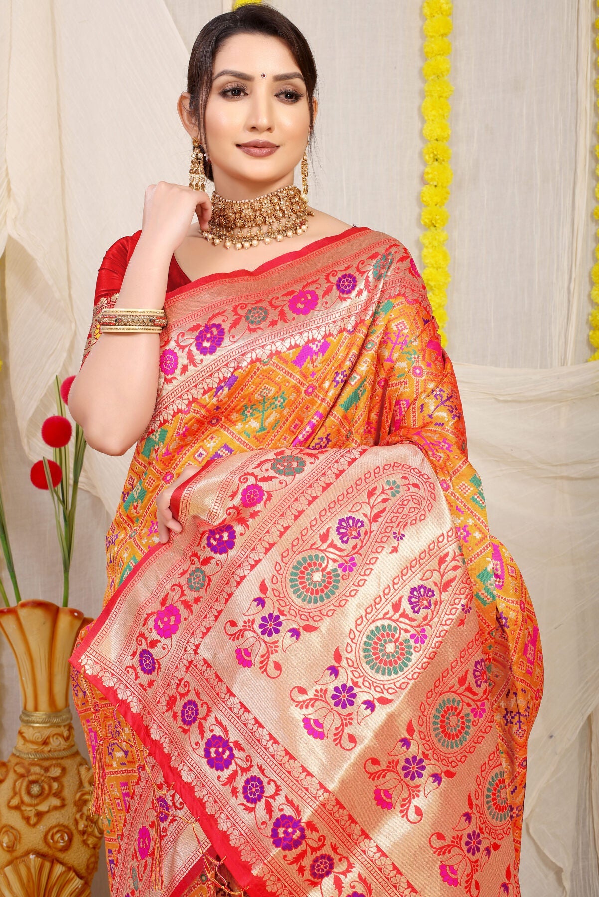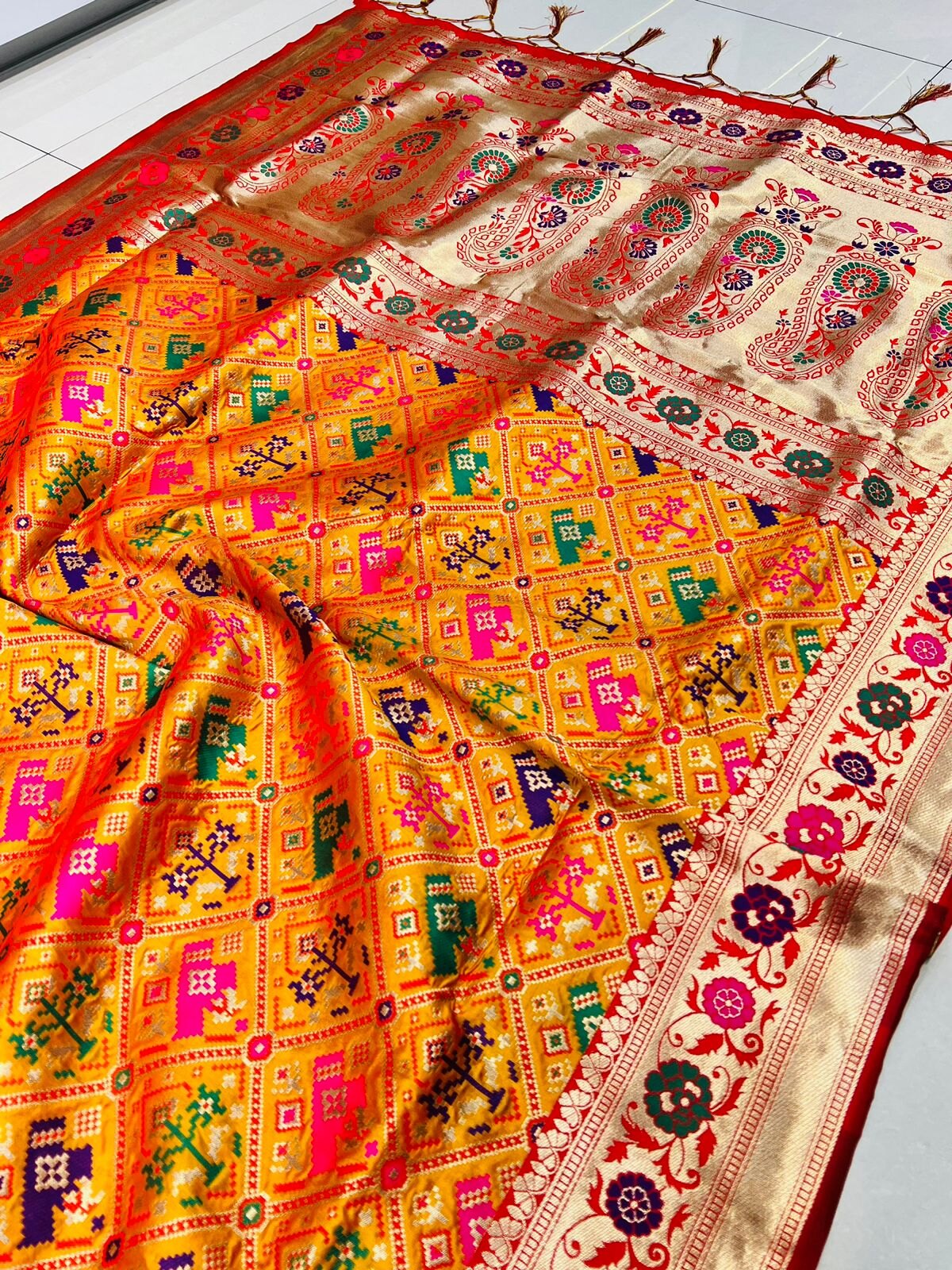 Breathtakingly beautiful paithani art. Marvelous blend of gorgeous color pallet and ethnic motifs. wrap this luxury around your arms and feel the paradise, Be it your anytime function or occasion, we swear you won't regret wearing this legacy.