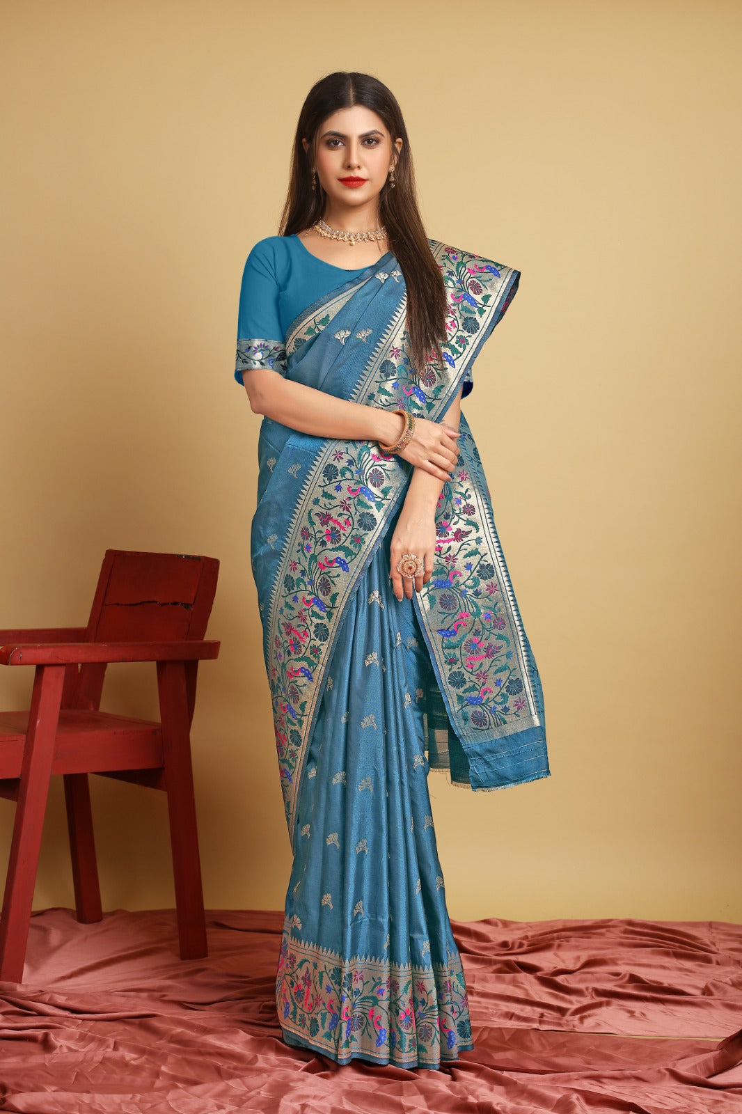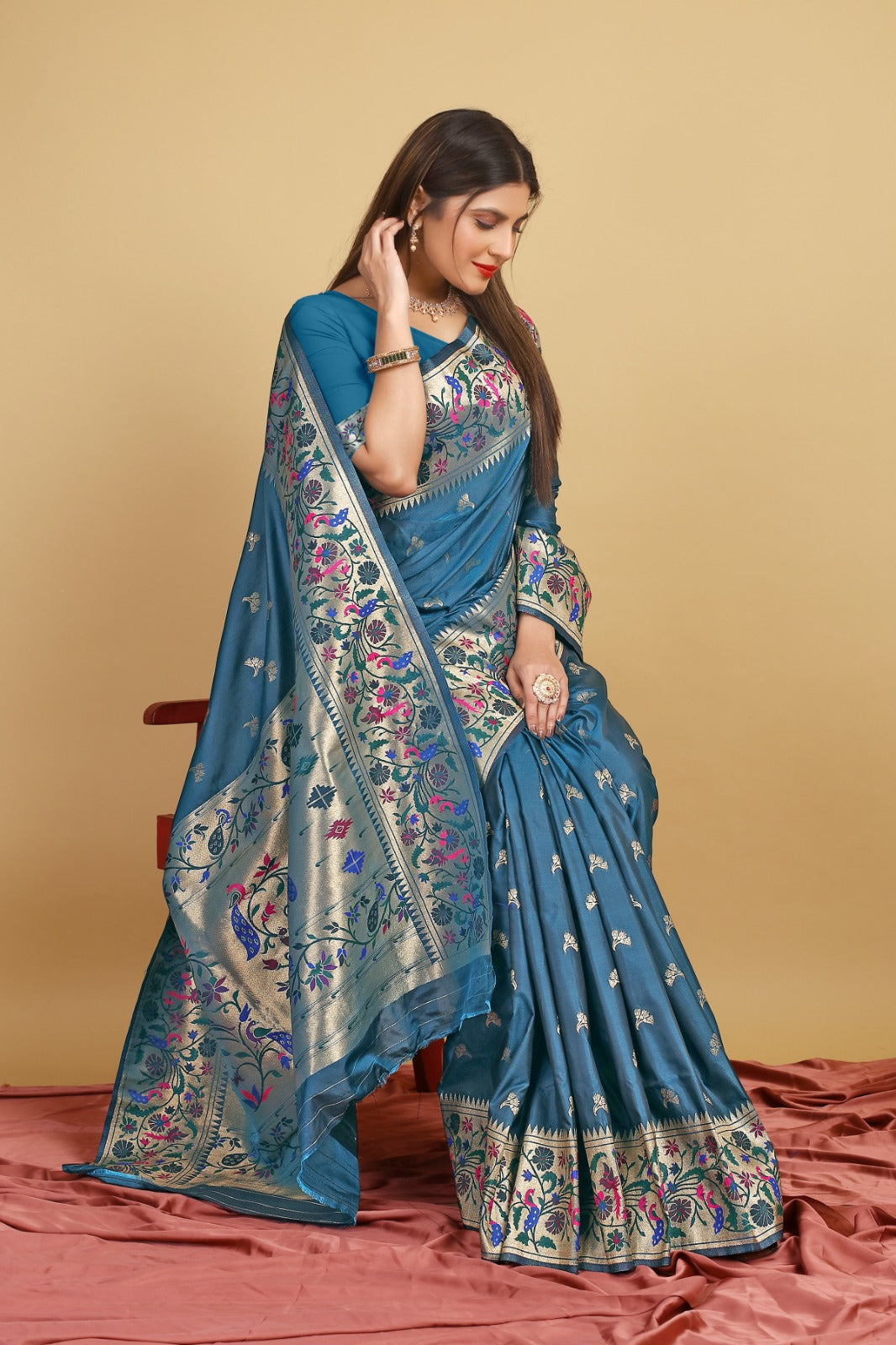Adorn yourself with our elegant, handcrafted Paithani Silk Saree that exudes grandeur with a touch of elegance. This masterpiece is meticulously crafted using golden zari weaving, a technique that gives the fabric its stunning luster and charm. The rich, vibrant hues of this saree make it a perfect outfit choice for special occasions. This Paithani Silk Saree is a splendid way to represent the timeless beauty of Indian heritage.