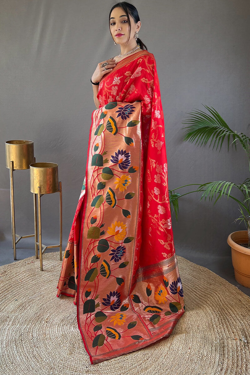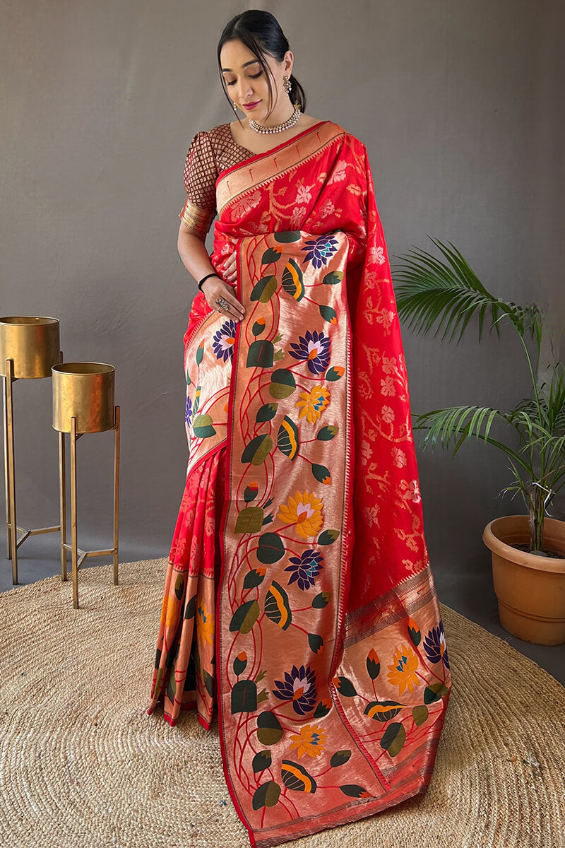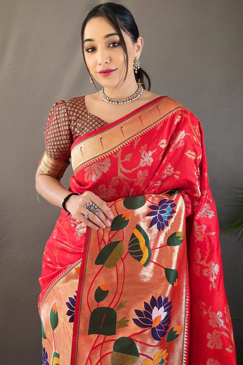 Engrossing Red Paithani Silk Saree With Hypnotic Blouse Piece
