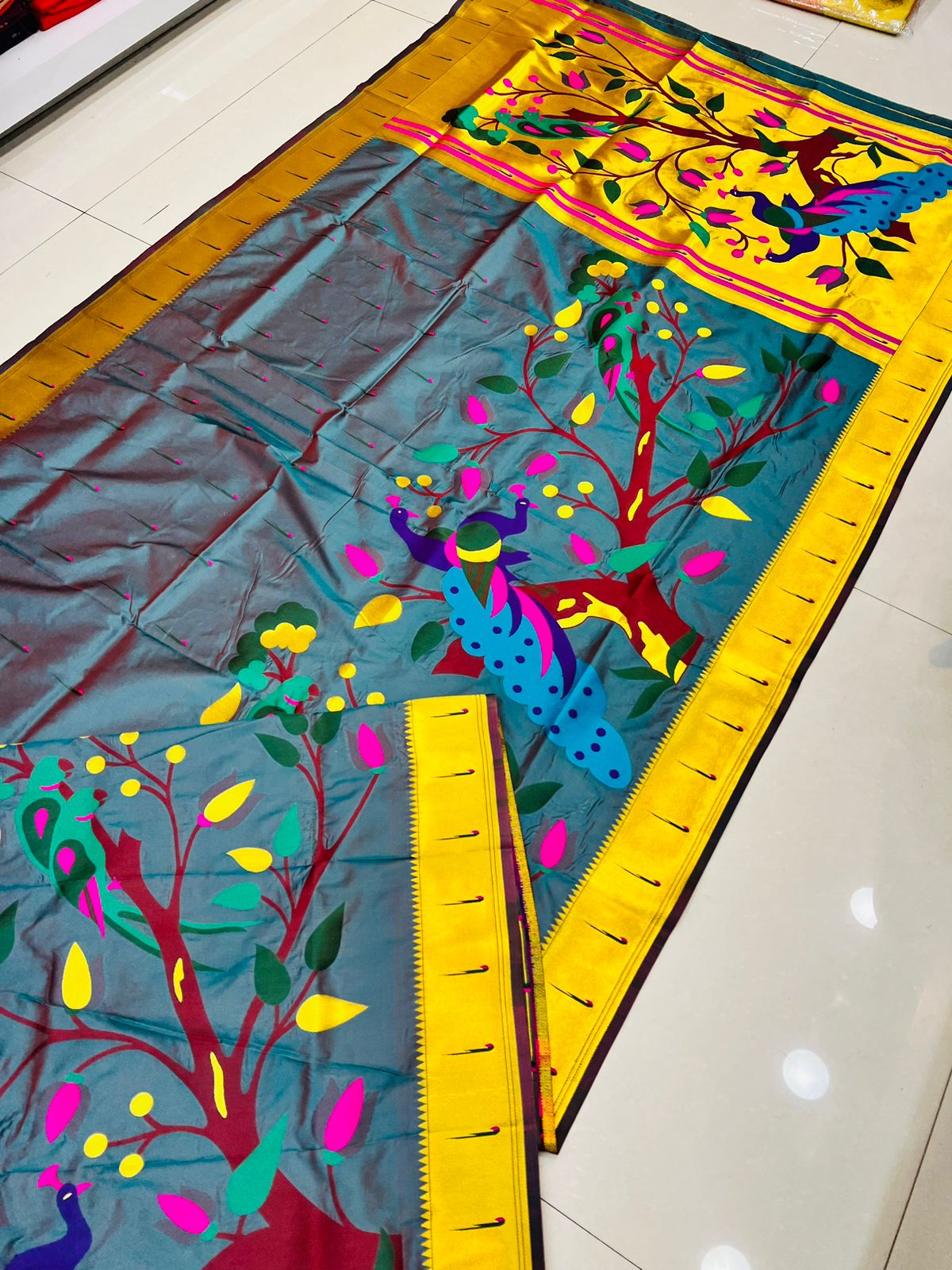 The saree is adorned with intricate motifs inspired by nature, such as peacocks, flowers, and vines. These motifs are meticulously woven into the fabric using vibrant and contrasting colors, creating a mesmerizing visual spectacle. The silk used is of the finest quality, ensuring a regal and comfortable wearing experience.