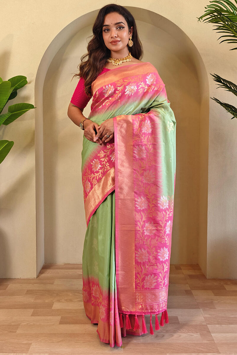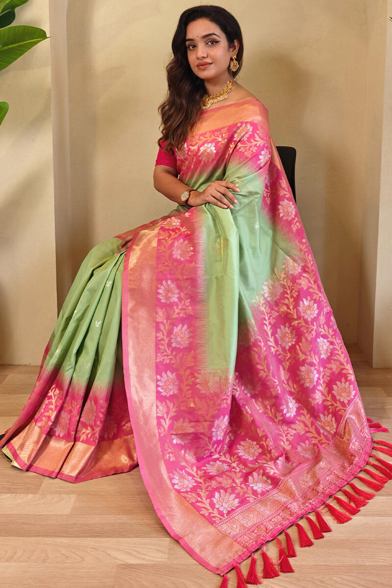 Dive into elegance with our Soft Banarasi Silk Saree. Made from luxurious silk, this saree will surely make you stand out at any special occasion. The intricate Banarasi weave adds a touch of sophistication, while the lightweight fabric ensures comfort all day long.