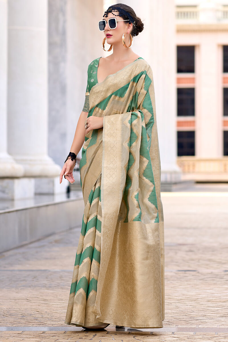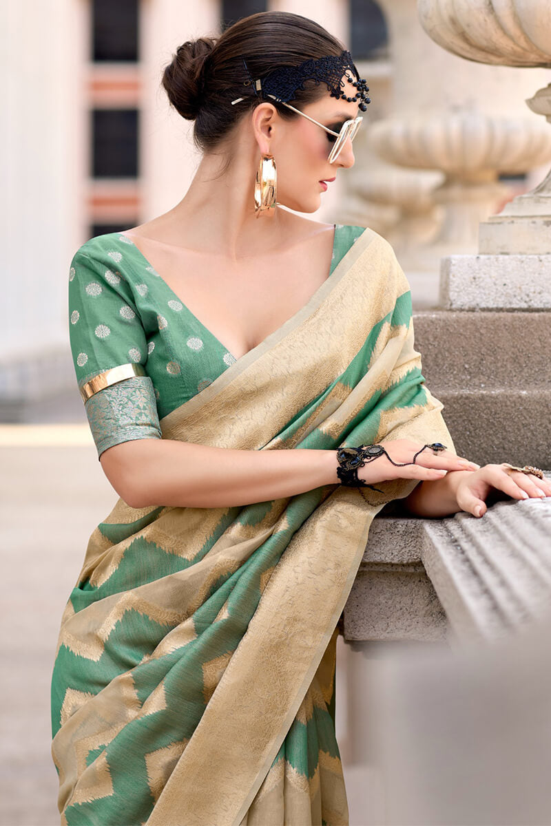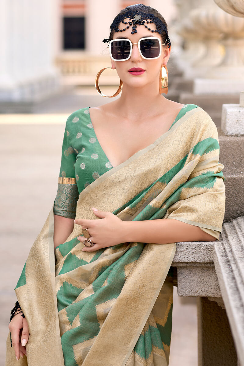 Evanescent Beige and Green Cotton Silk Saree With Lassitude Blouse Piece