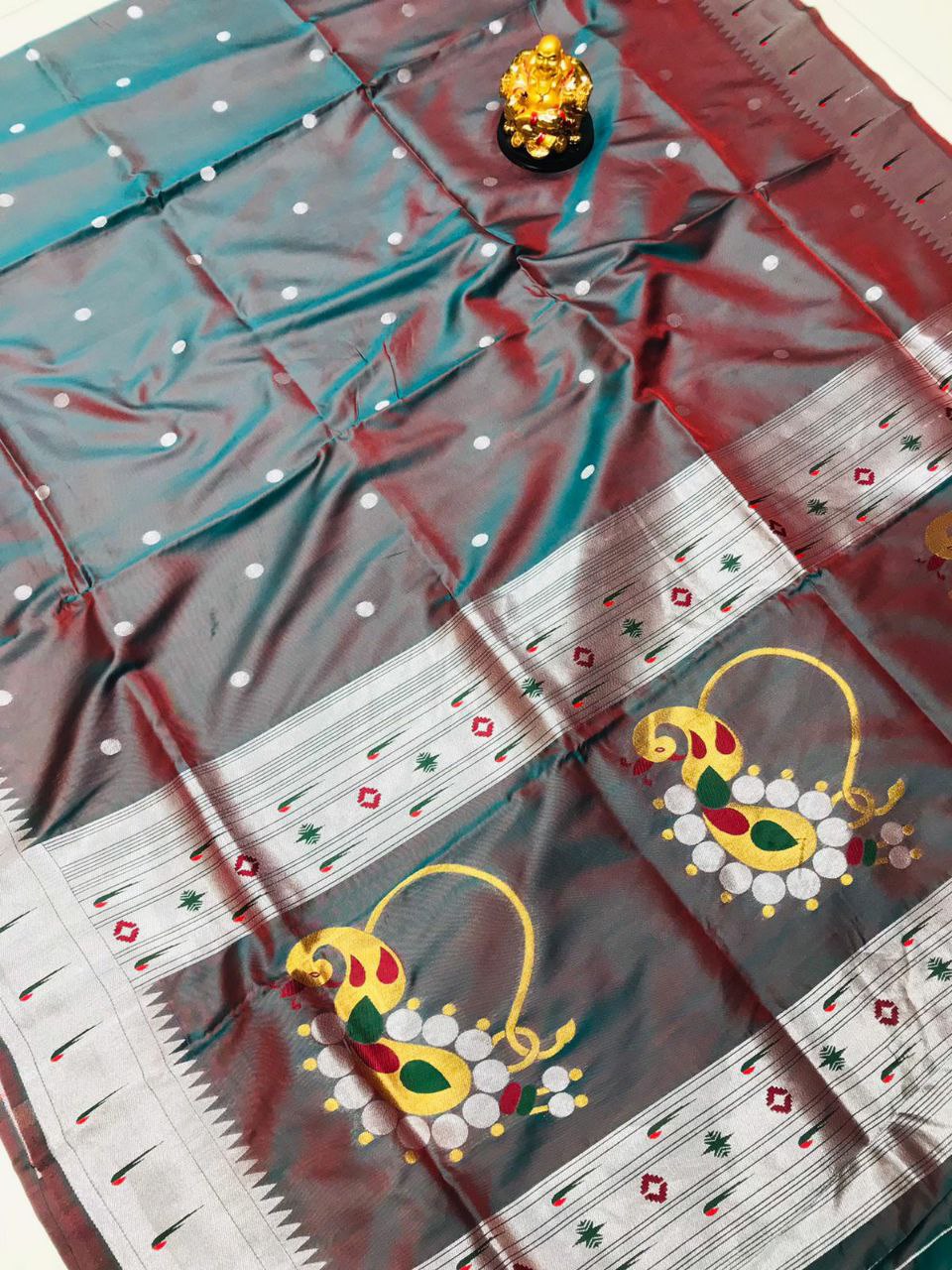 Paithani sarees are always in with their royal appeal. Made out of chosen threads, this choice will make you stand out. Drape it as you like, it will look flawless. The intricate timeless design on this grand saree is perfect for a grand occasion.