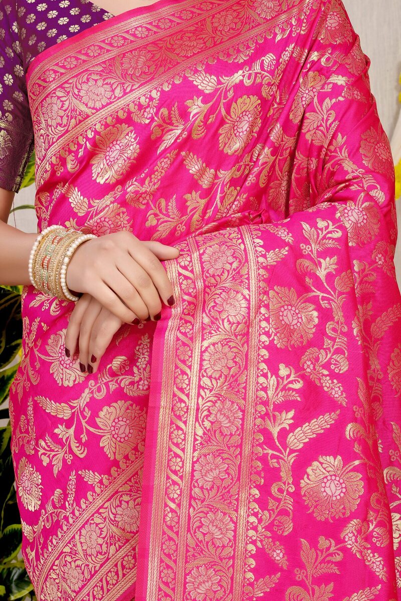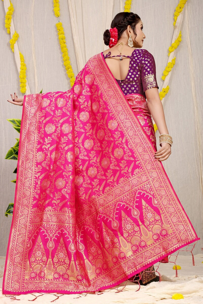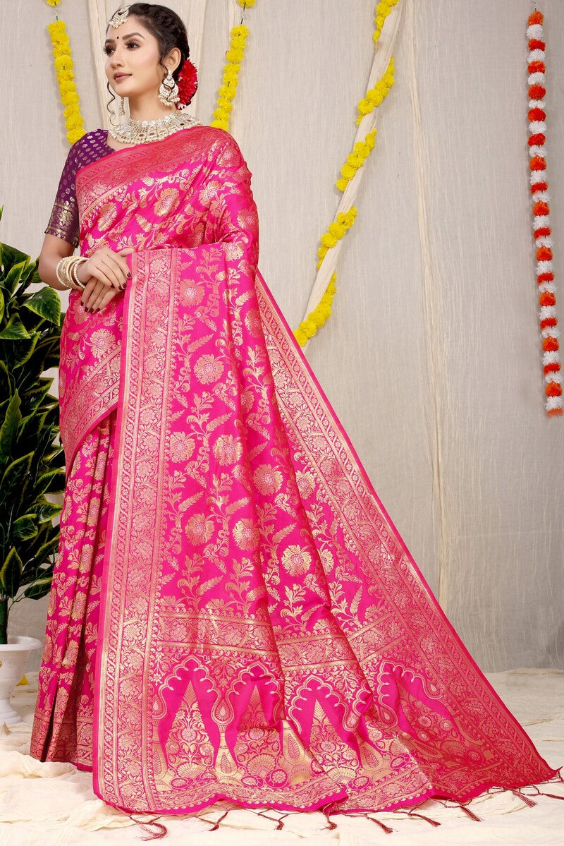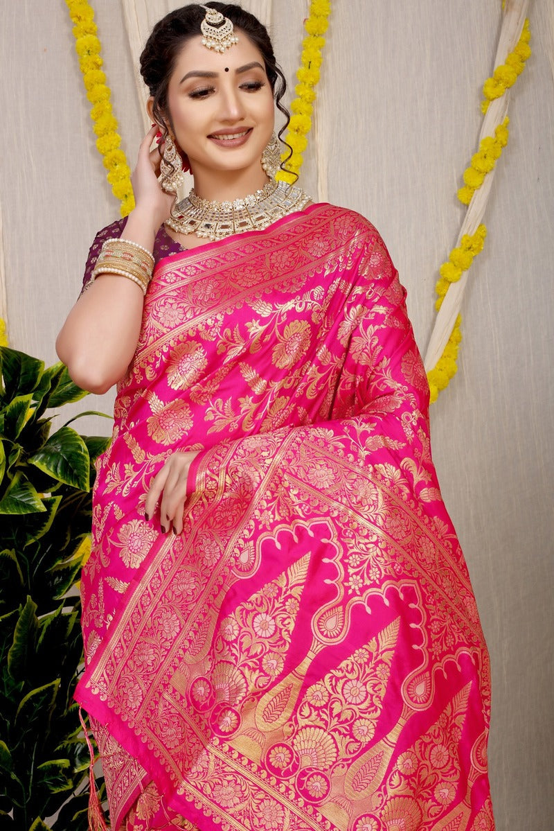 Extraordinary Dark Pink Soft Banarasi Silk Saree With Nemesis Blouse Piece