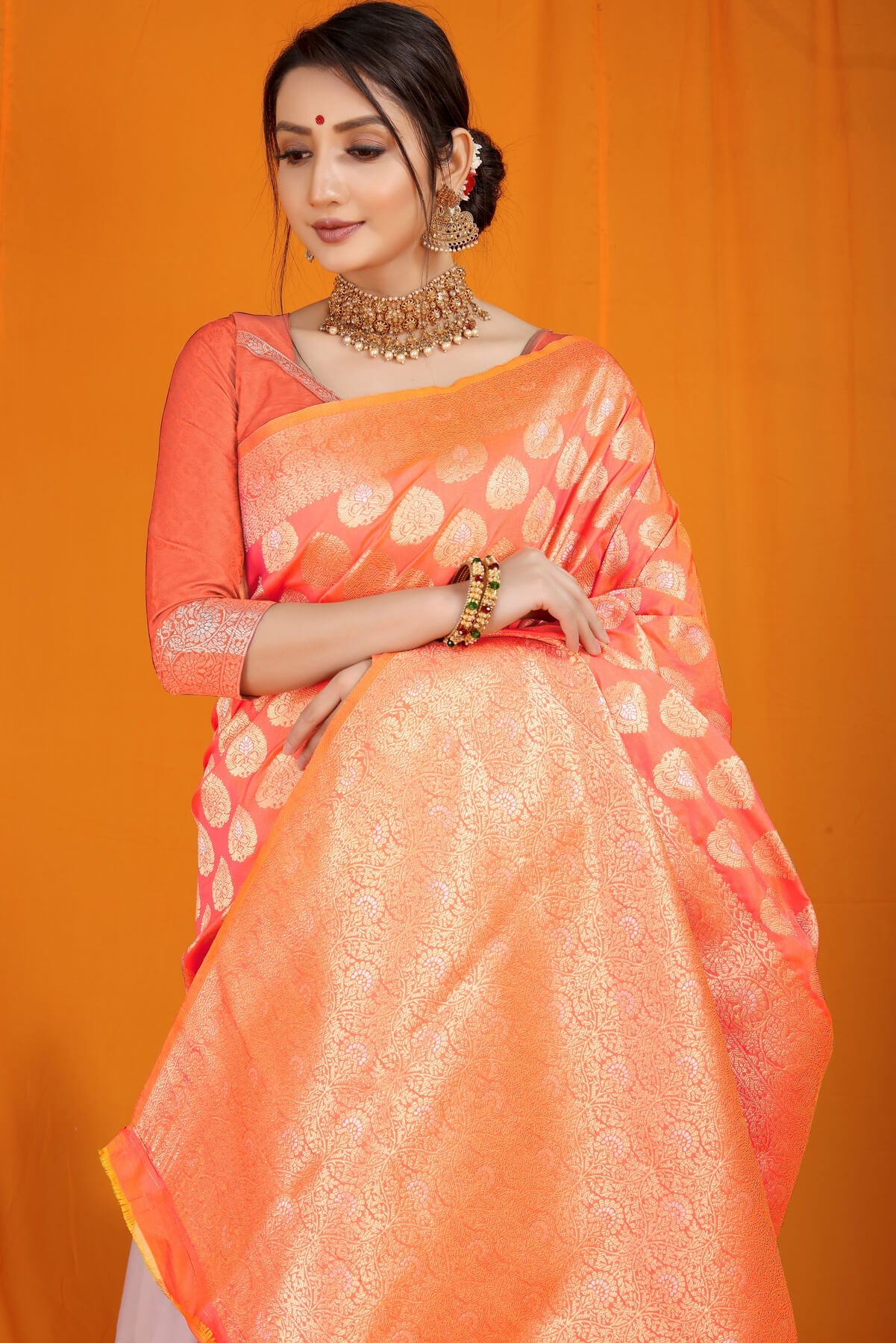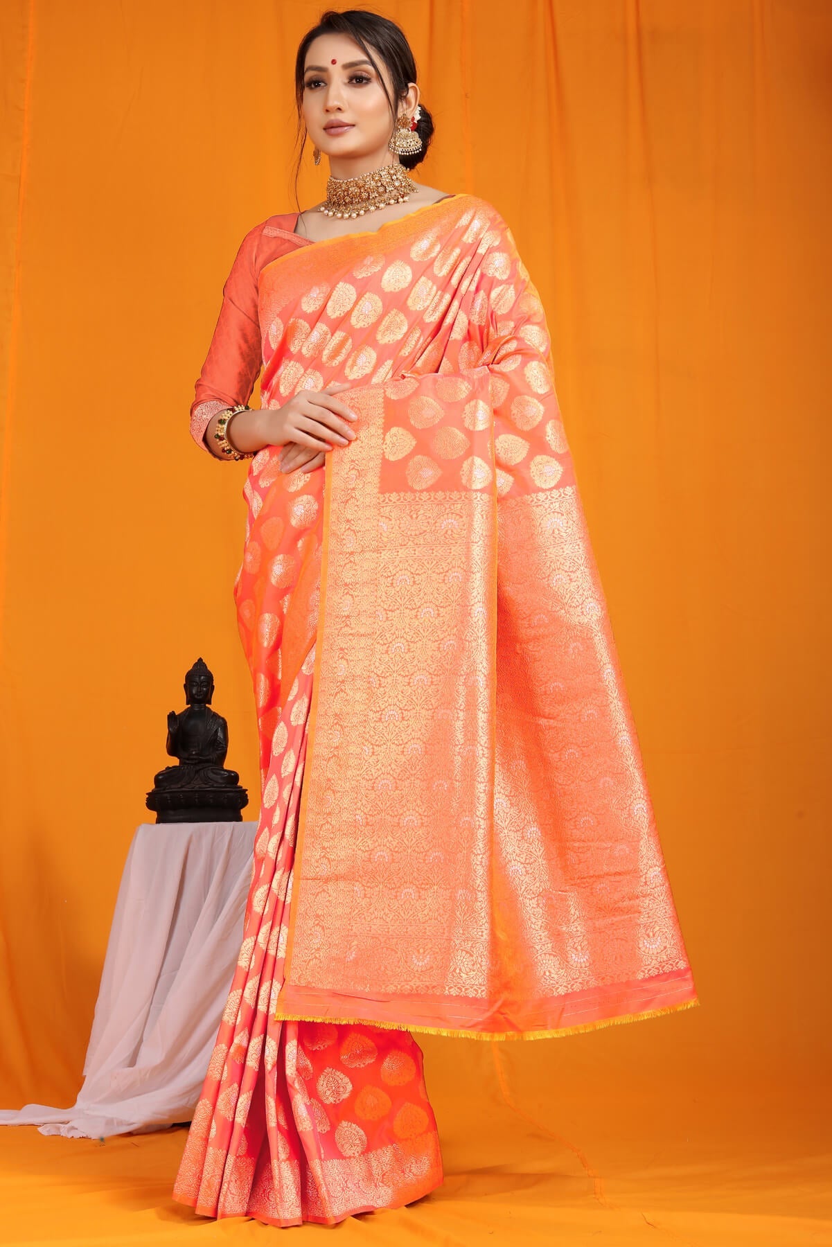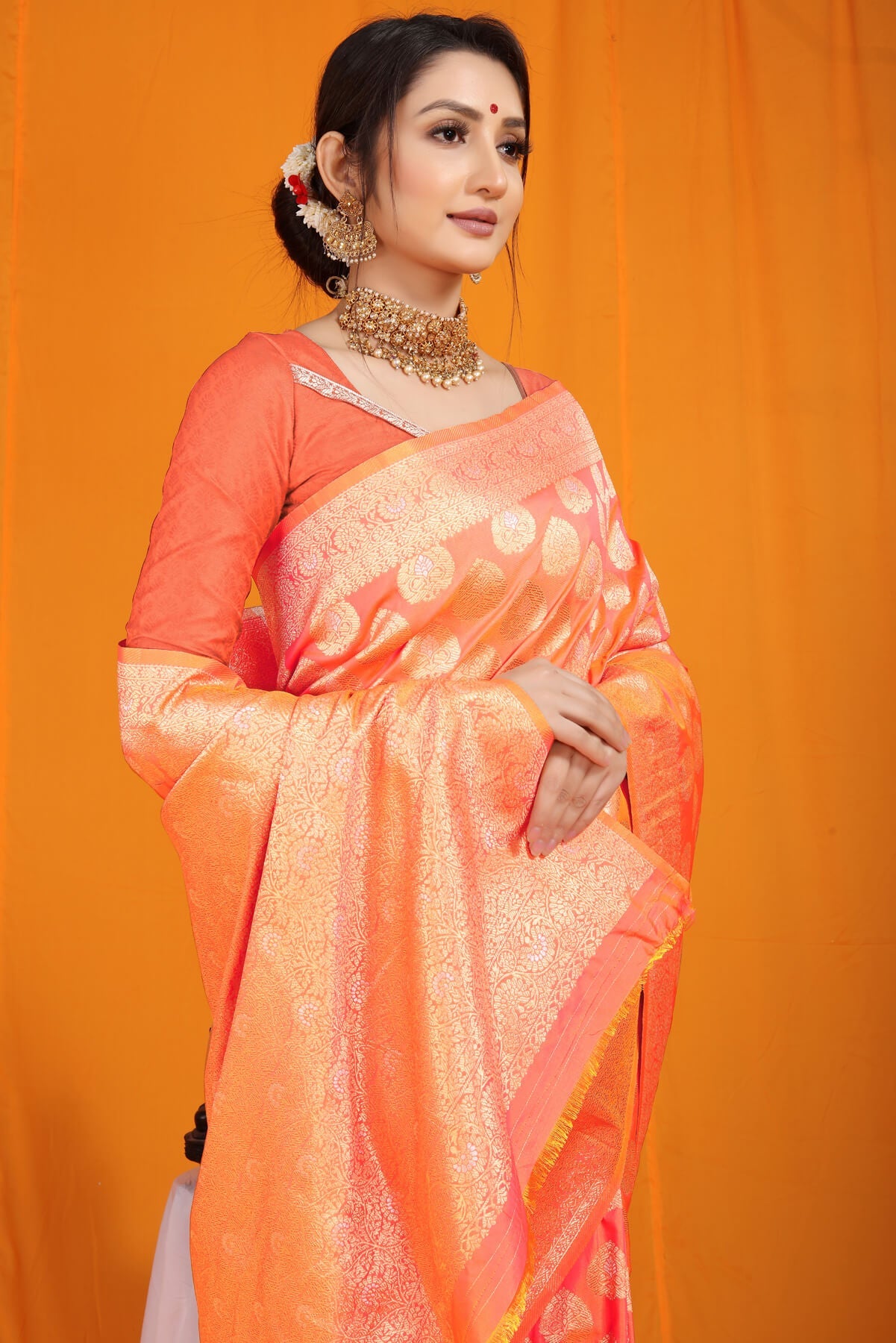 Be an angel and create and establish a smashing influence on everybody by carrying this traditional Banarasi saree. This saree is crafted by skilled weaver of Banaras with elegance and grace, this saree is definitely the epitome of beauty and a must have in your collection. Style it with your best pair of heels, gold or Moti necklace and a potli bag for the perfect look.
