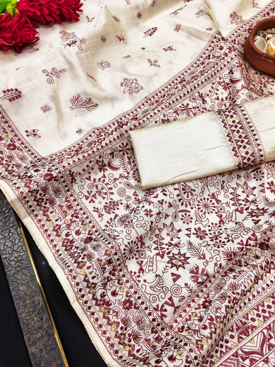 Forbearance Off White Embroidery Work Tussar Silk Saree With Dalliance Blouse Piece