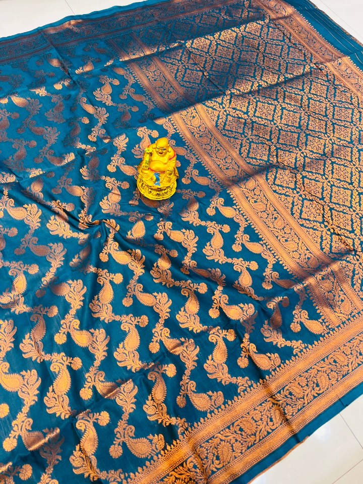Inspired by centuries of tradition, presenting esoteric banarasi silk, sparkling silver zari buta & border a saree that sets you apart from the other, pair it up as you like and add the glam!!