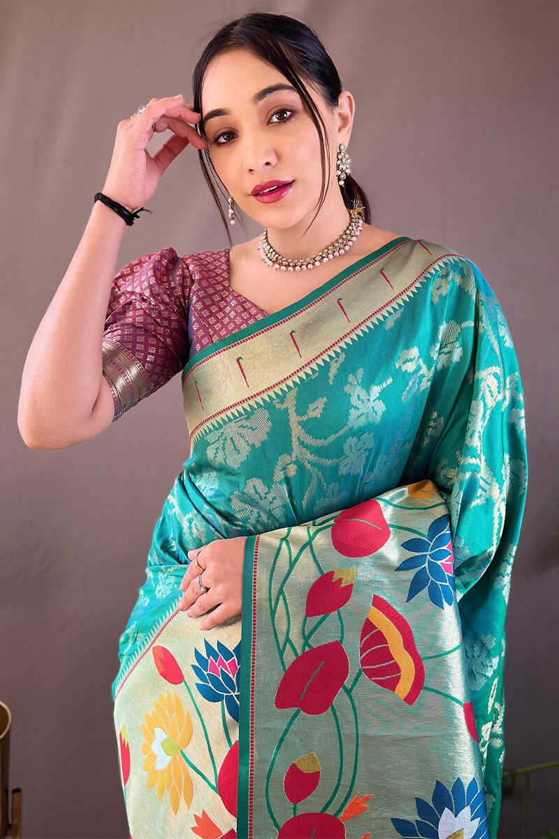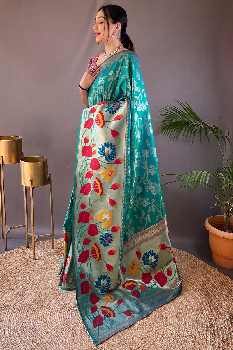 Girlish Rama Paithani Silk Saree With Surpassing Blouse Piece