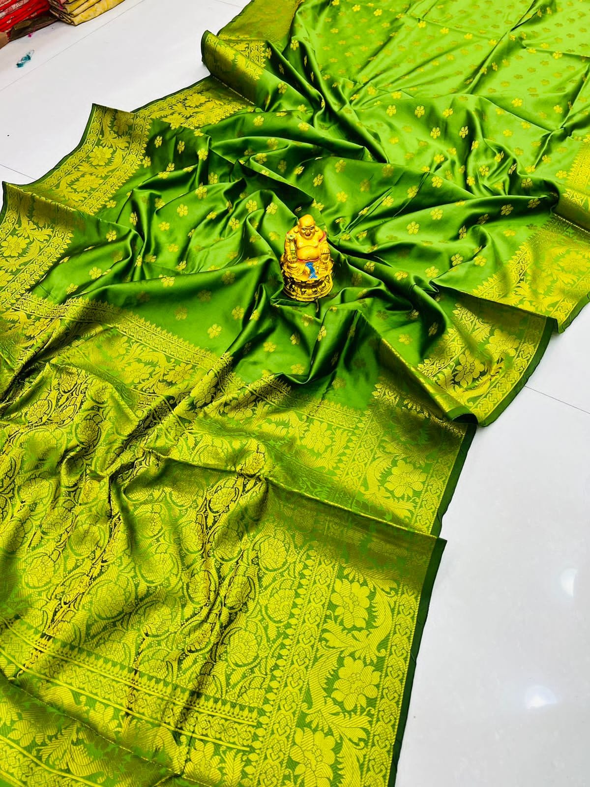 Glittering Mehndi Soft Banarasi Silk Saree With Enchanting Blouse Piece
