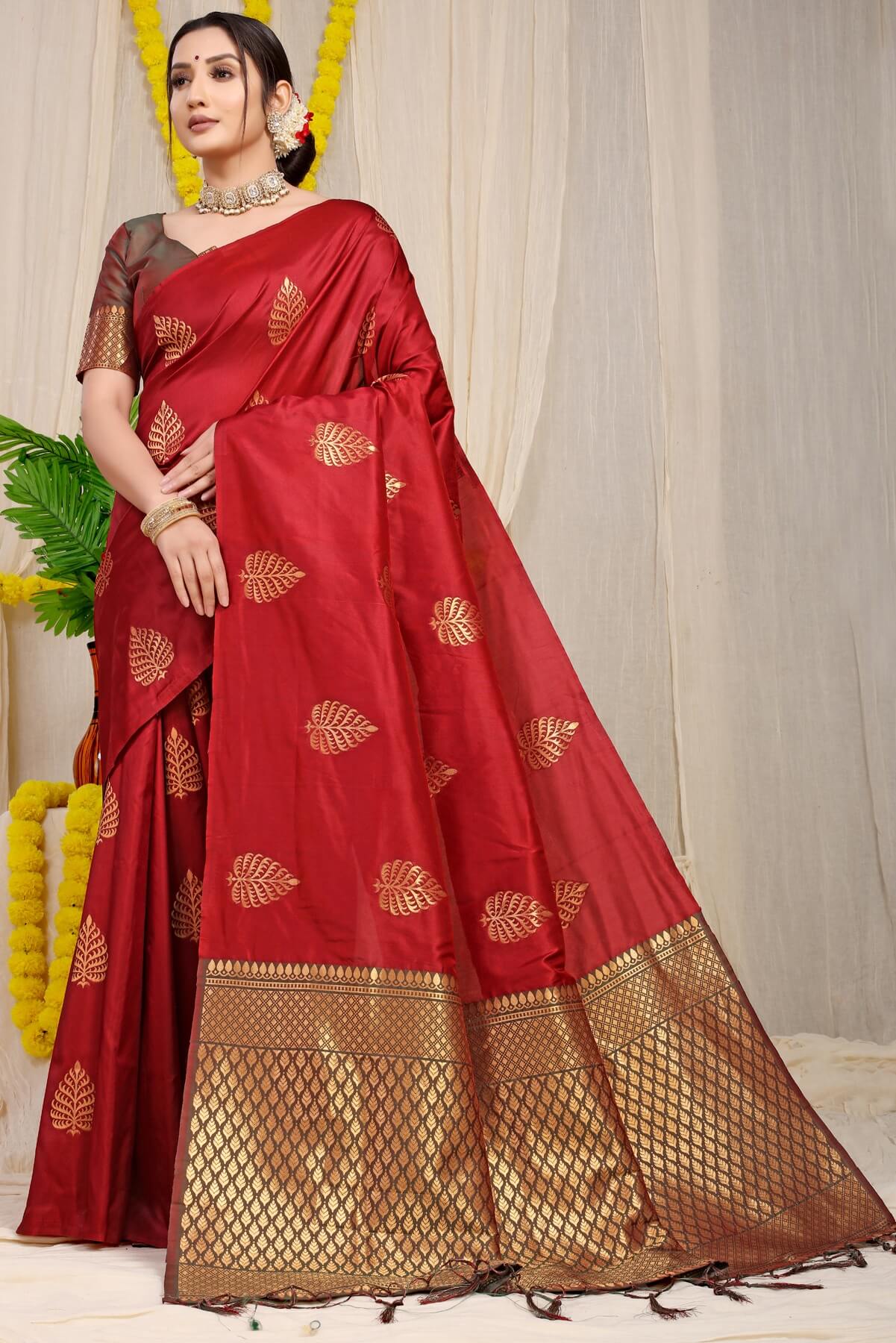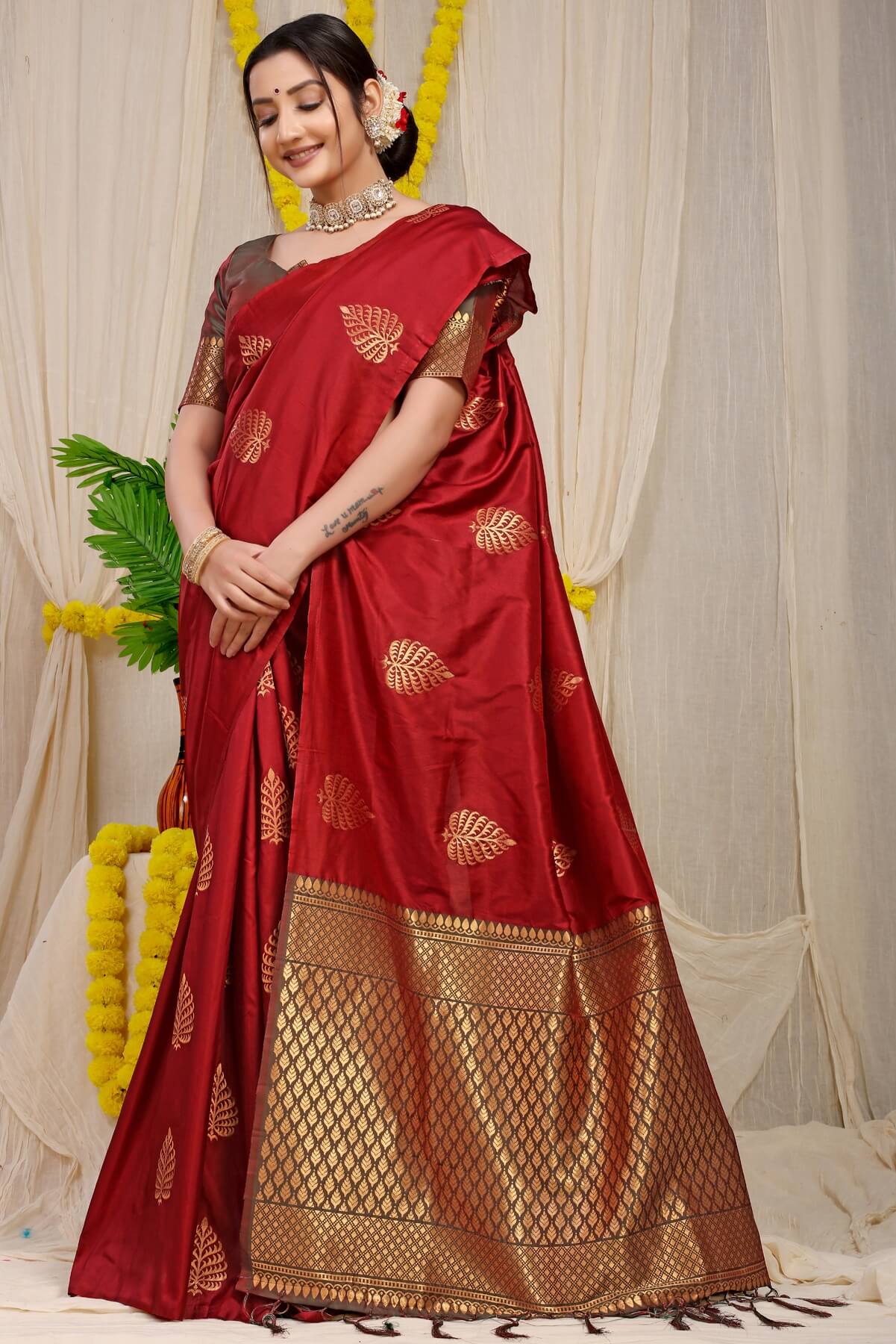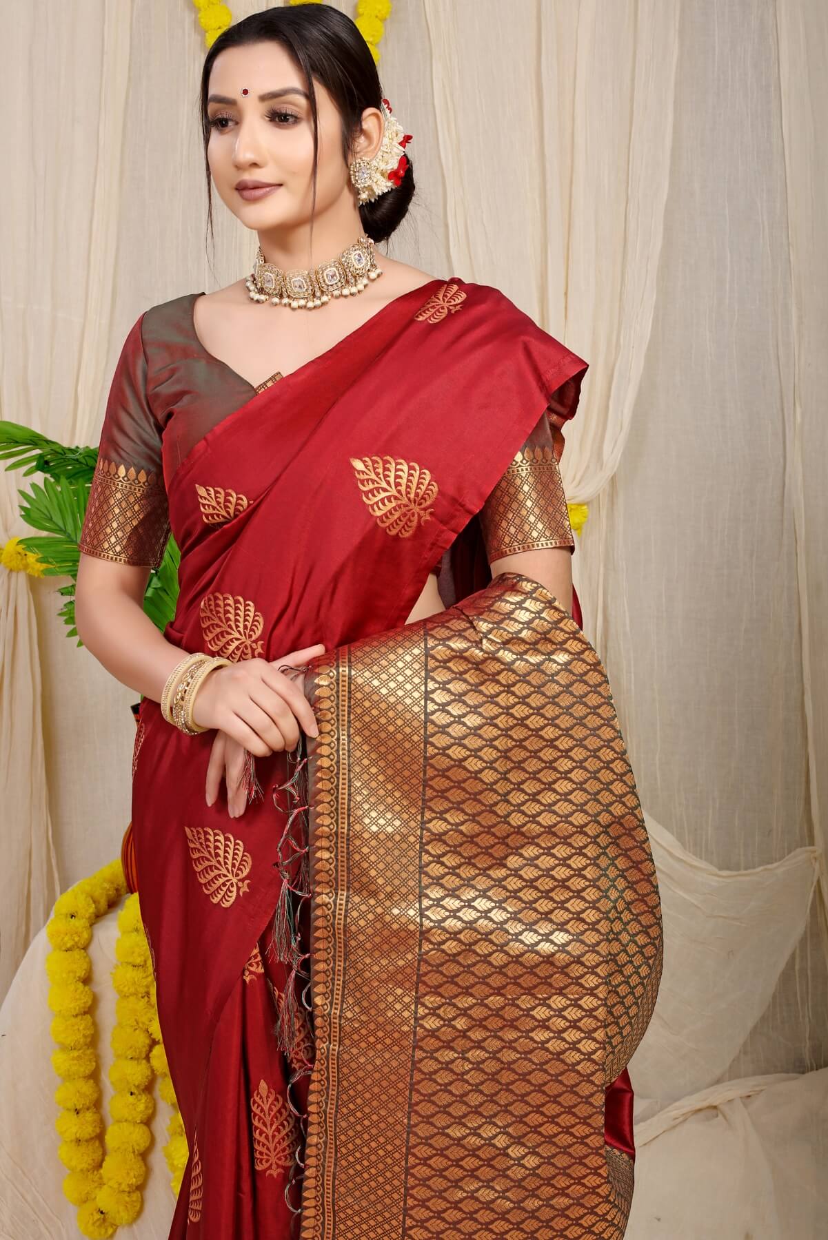 Glowing Maroon Soft Banarasi Silk Saree With Lissome Blouse Piece