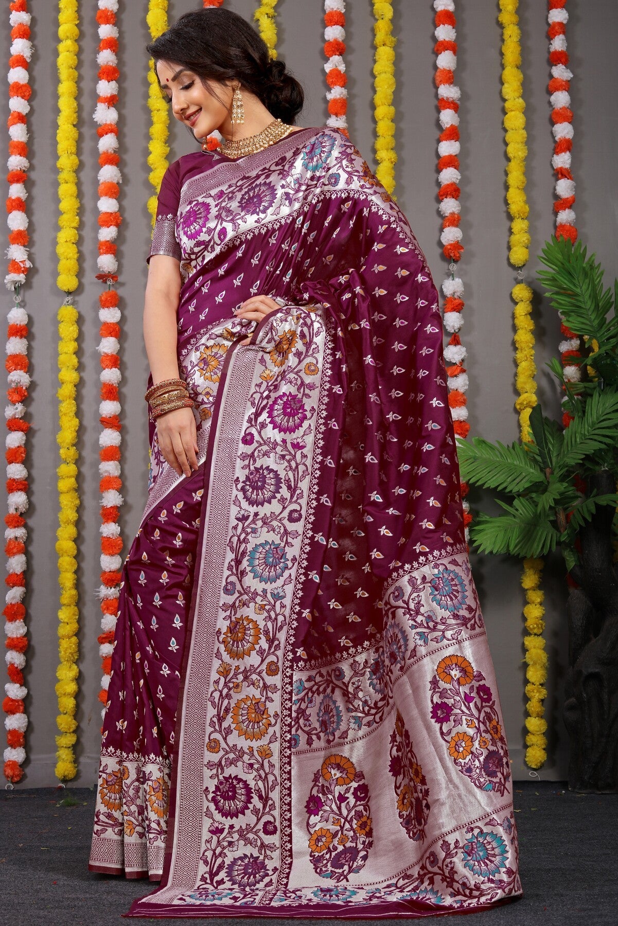 Gratifying Wine Banarasi Silk Saree With Scintilla Blouse Piece
