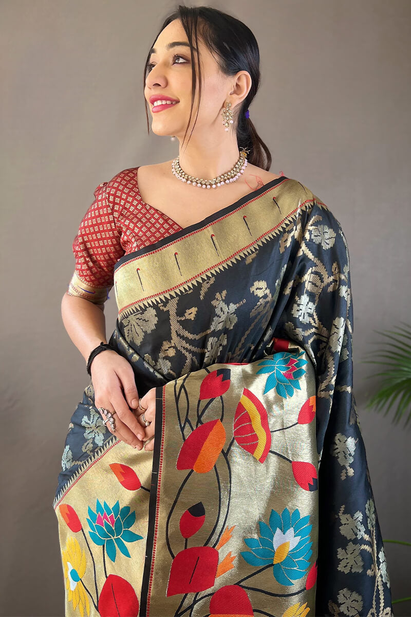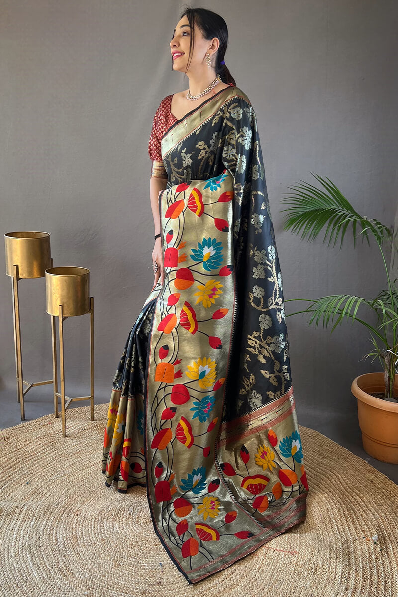 Invaluable Black Paithani Silk Saree With Designer Blouse Piece