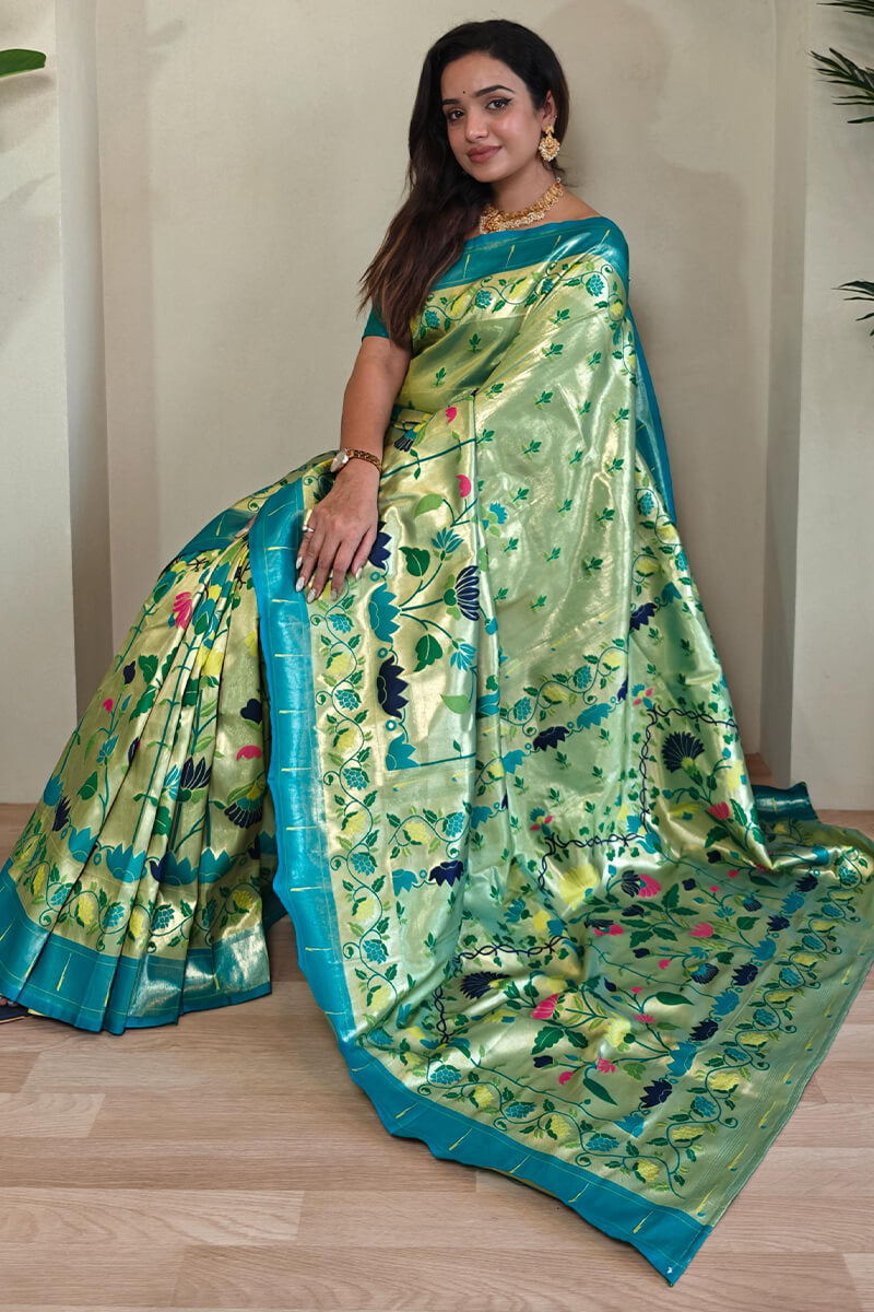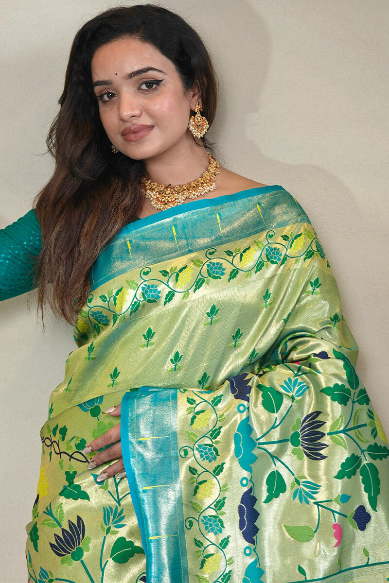 Experience the allure of the Paithani Silk Saree, a sartorial marvel that captures the essence of Indian heritage and beauty. Meticulously handcrafted with sumptuous silk threads and intricate detailing, this saree radiates grace and elegance.