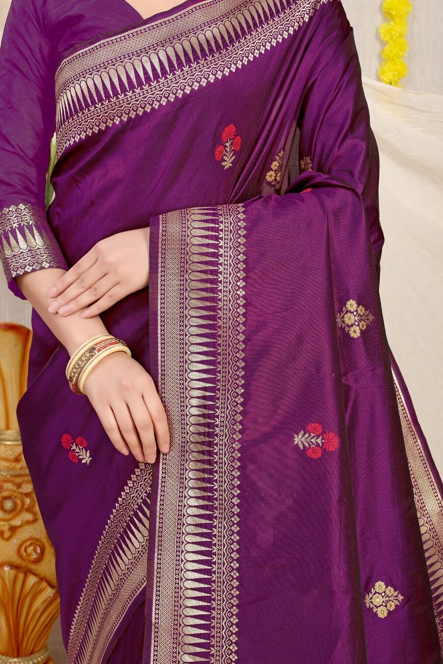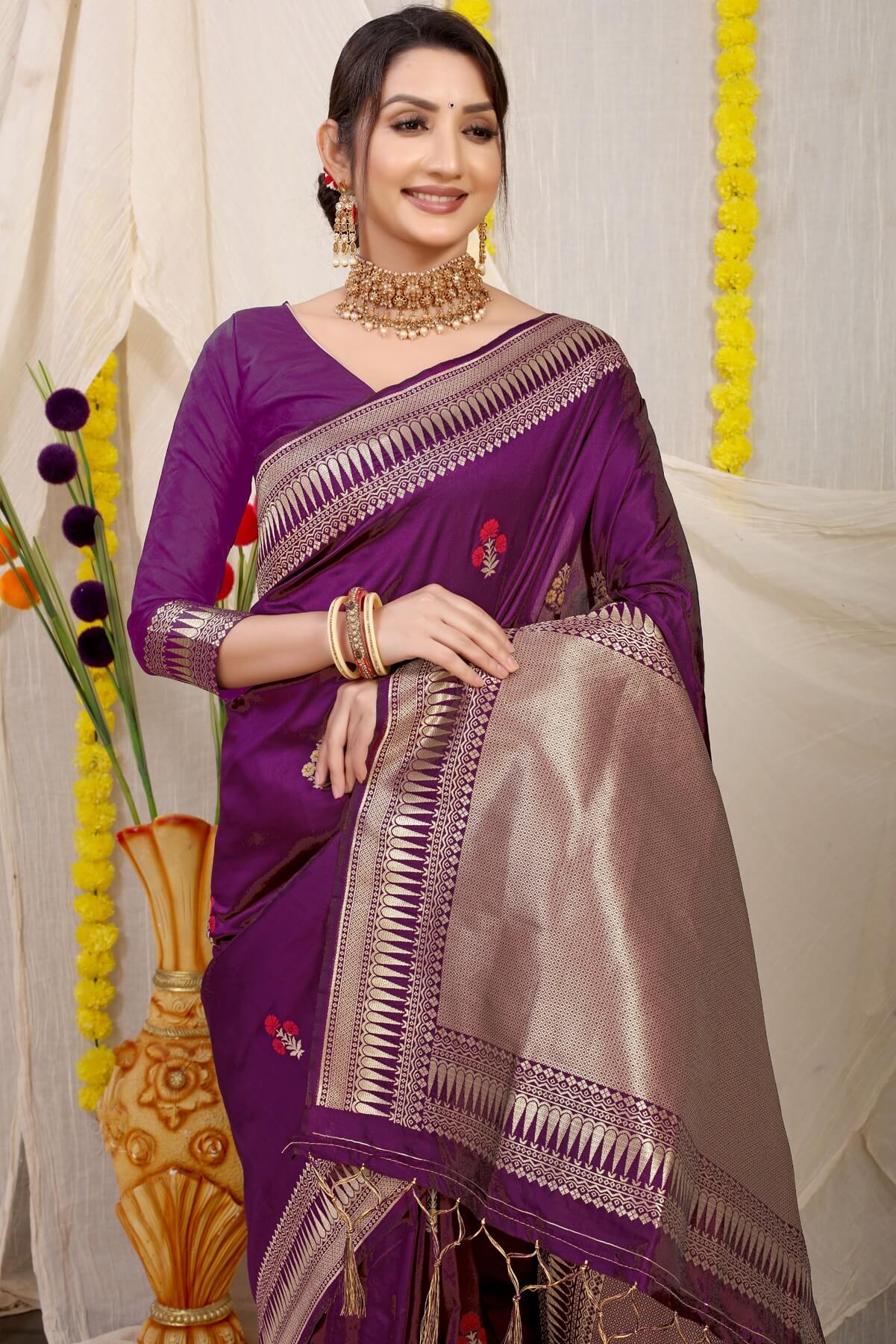 Lovely Purple Banarasi Silk Saree With Magnetic Blouse Piece