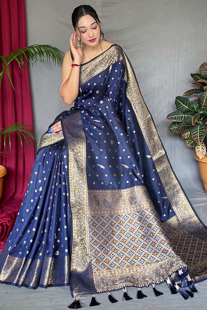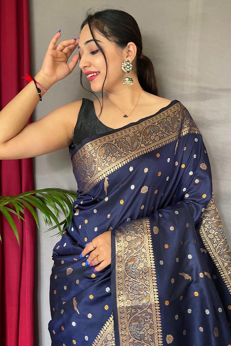 Luxuriant Navy Blue Soft Banarasi Silk Saree With Exemplary Blouse Piece