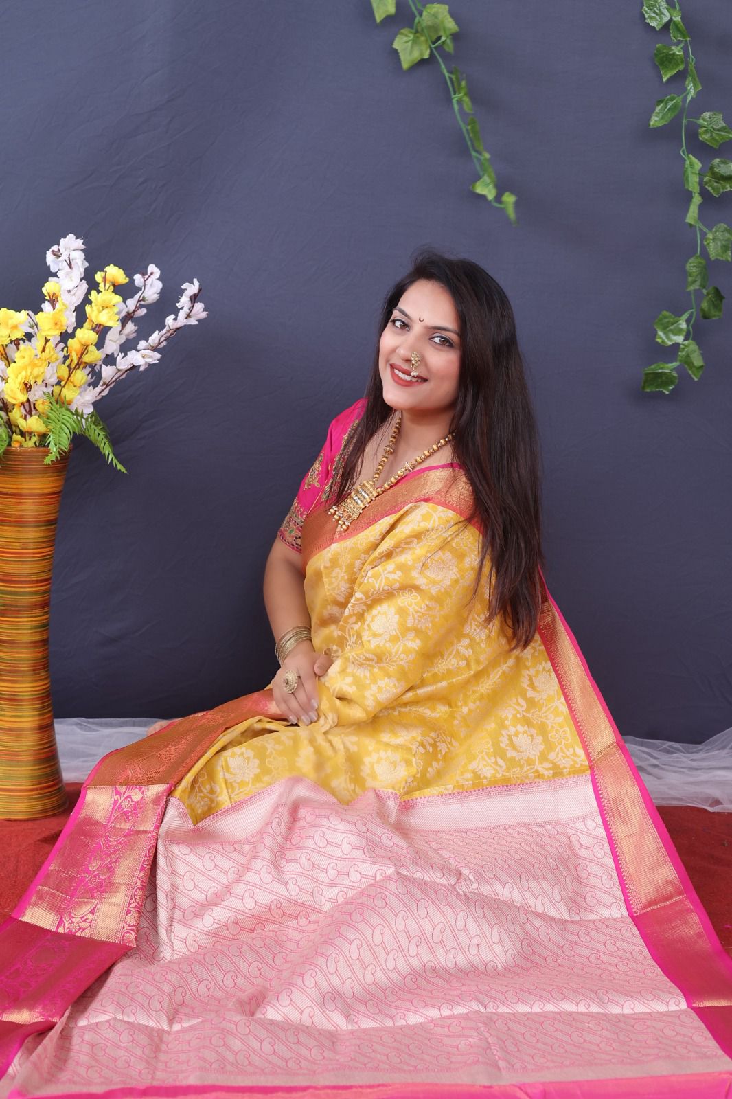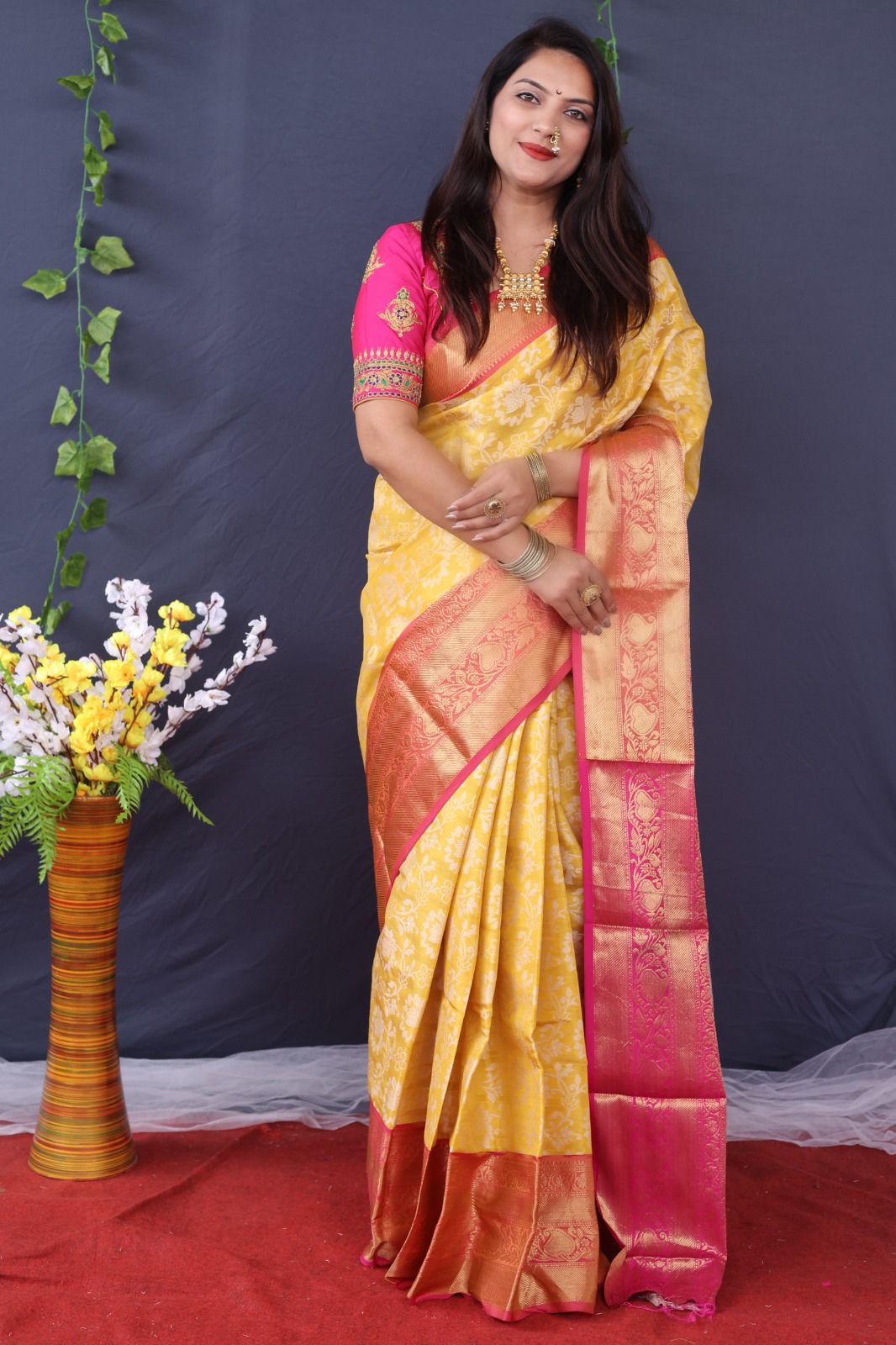 Indulge in pure luxury with our exquisite Kanjivaram silk saree, elaborately handwoven with intricate Zari weaving. The soft, delicate drape of the shimmering fabric complements the rich, ornate patterns, creating a stunning contrast that radiates with opulence. This saree is perfect for a special occasion, and is sure to leave everyone spellbound with its sheer magnificence.