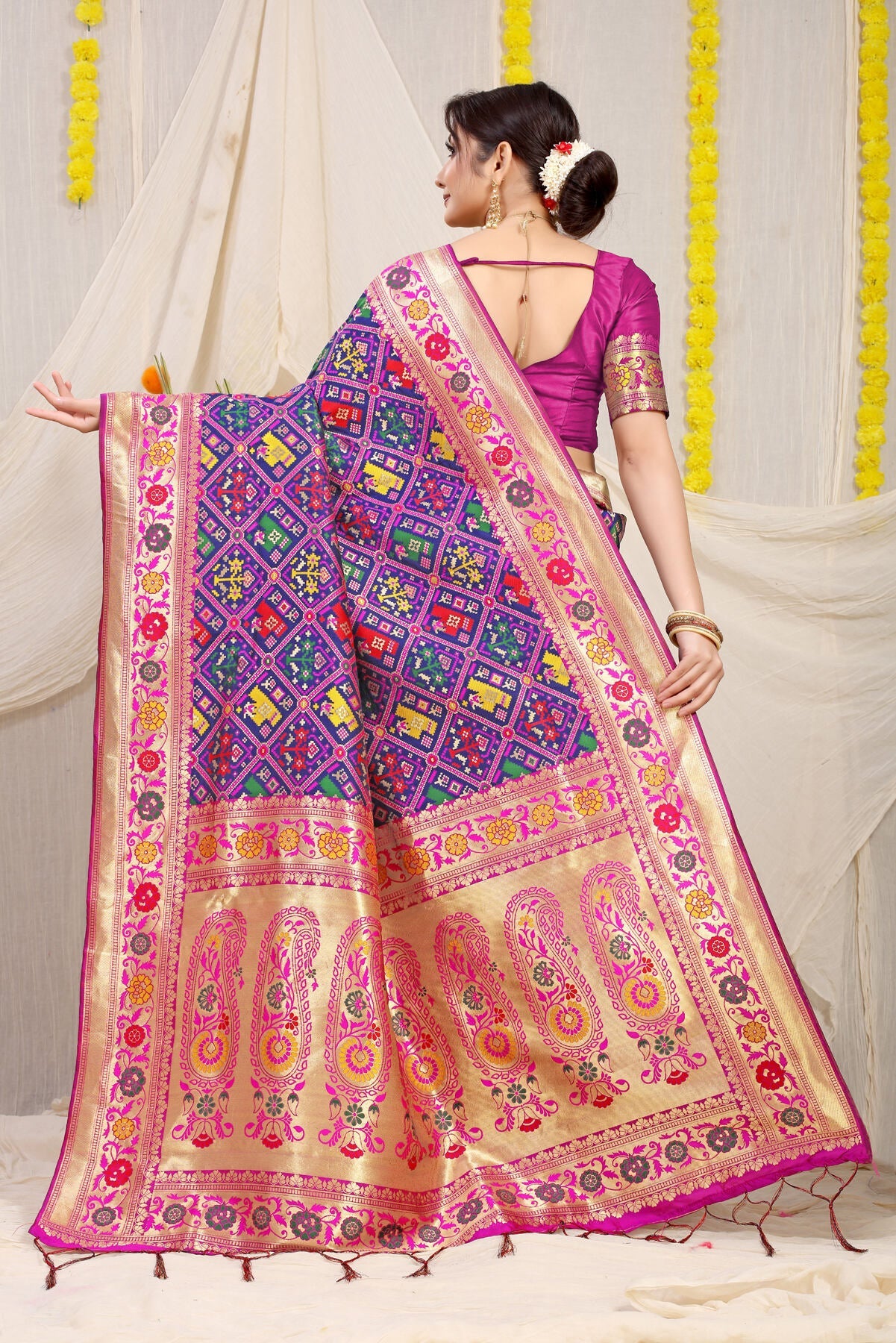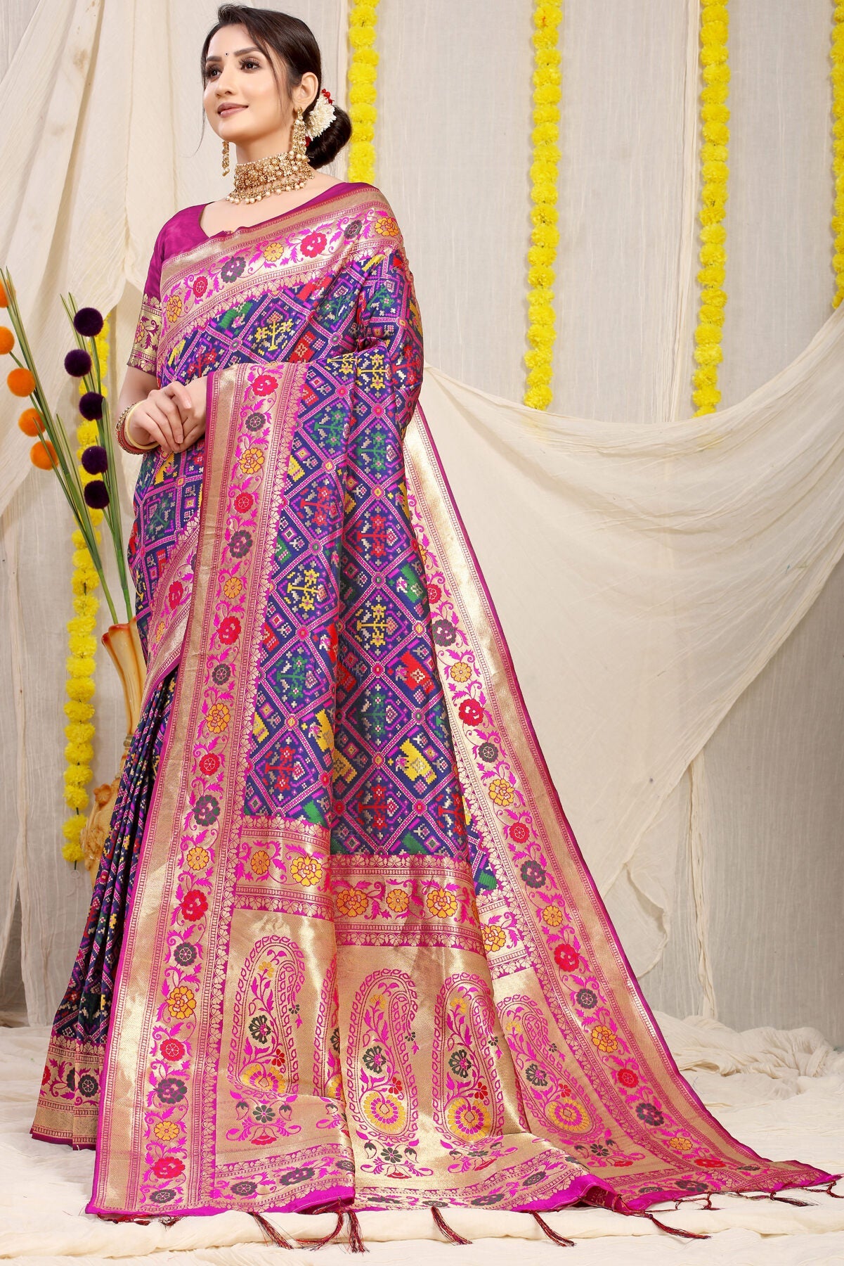 Breathtakingly beautiful paithani art. Marvelous blend of gorgeous color pallet and ethnic motifs. wrap this luxury around your arms and feel the paradise, Be it your anytime function or occasion, we swear you won't regret wearing this legacy.