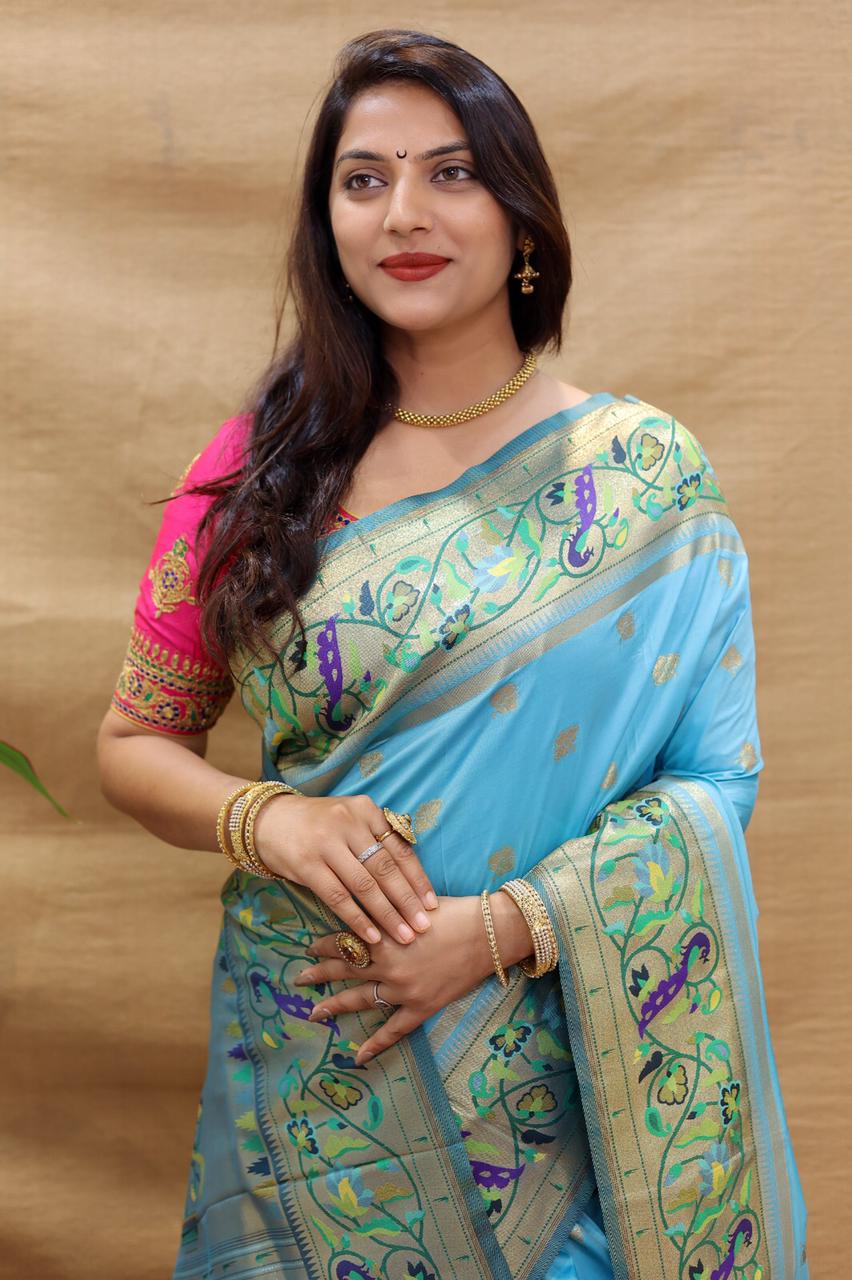 Experience the timeless elegance of Paithani Silk Saree with a stunning blouse piece that complements your style. Crafted meticulously with the finest silk, this saree boasts a luxurious sheen and vibrant hues. Adorned with intricate zari work and traditional motifs, it reflects the artistic heritage of Maharashtra.