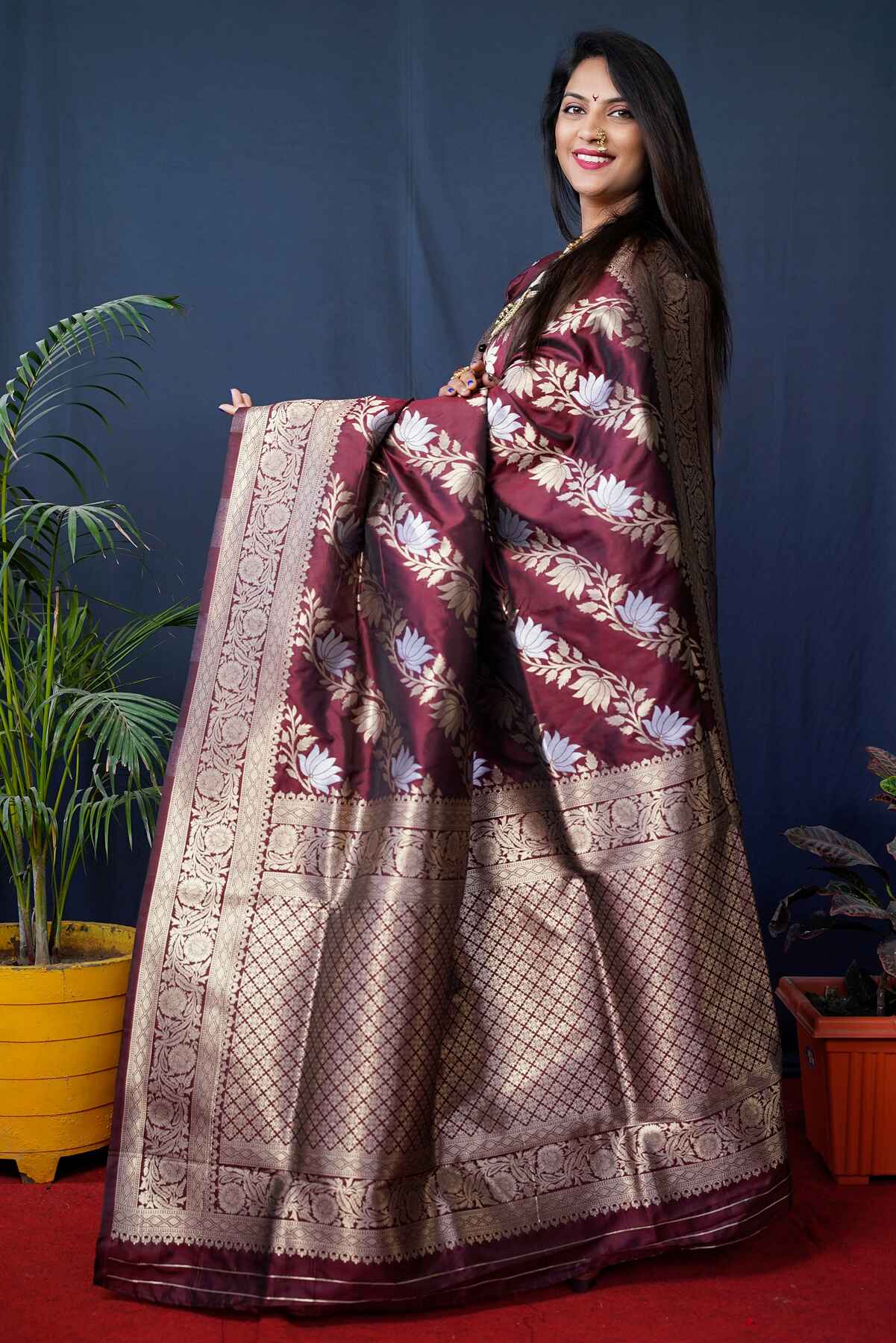 An opulence of vivid colors and lush gold, here comes our Handloom weaving Kanjivaram Silk collection from South India. These saris hold a special name for their intricate designing work embellished with golden threads and borders. This sparkling piece comes in shades of gold to brighten up your wardrobe and gift you a timeless charm.
