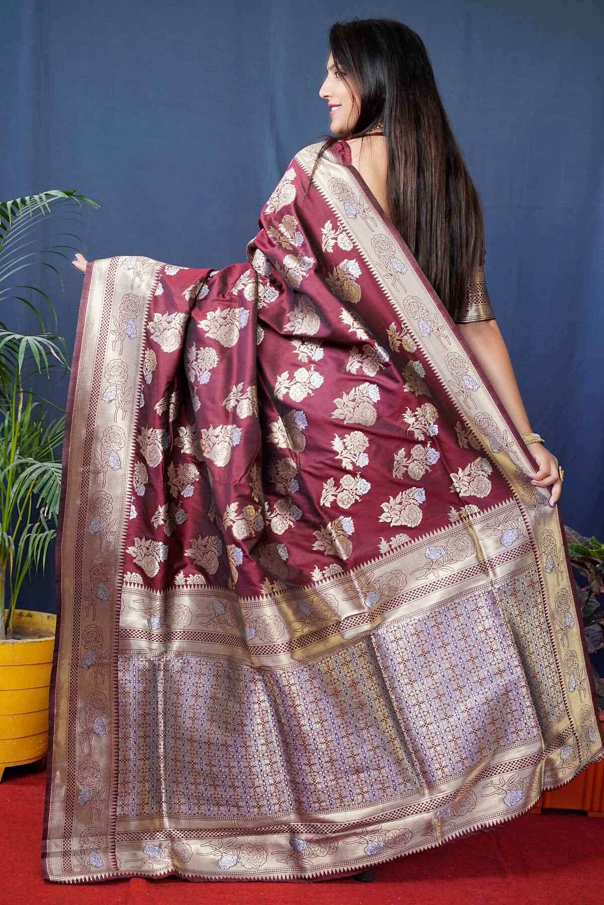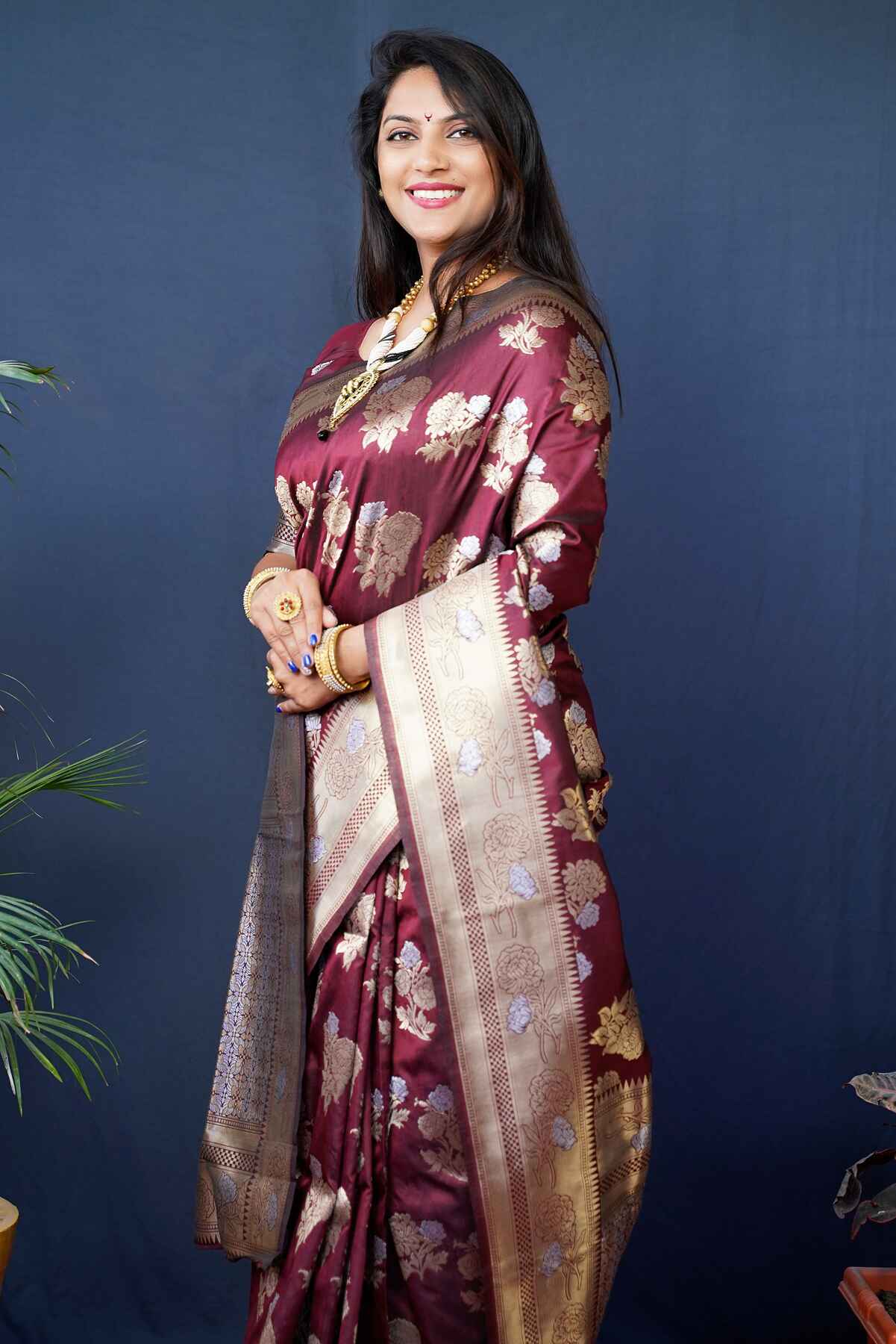 Opulent Wine Kanjivaram Silk Saree With Glittering Blouse Piece
