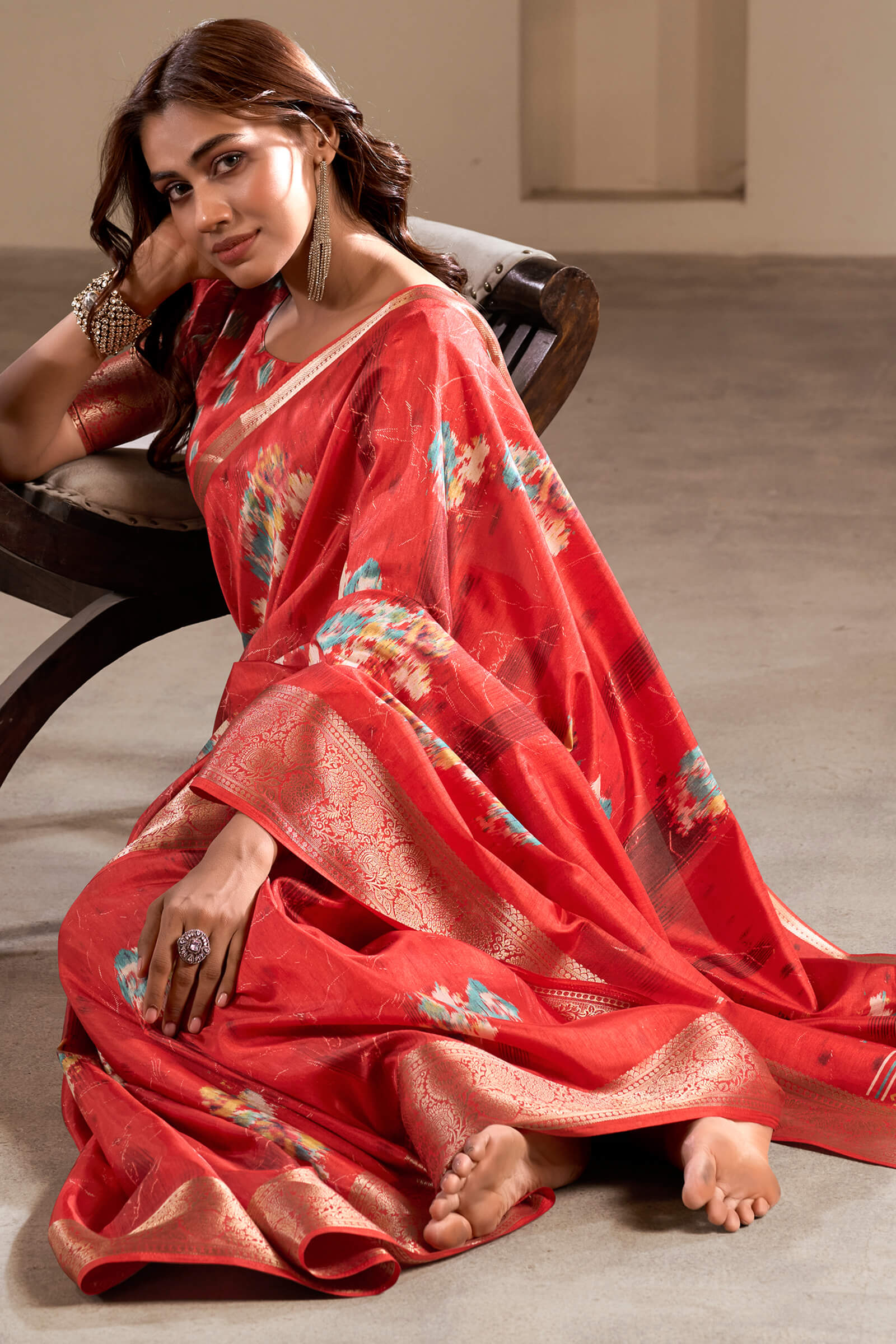 Elevate your ethnic wardrobe with our exquisite Digital Printed Dola Silk Saree. Crafted from luxurious dola silk fabric, this saree features intricate zari woven details that add a touch of elegance to any occasion. The digital printing ensures vibrant colors and intricate designs that are sure to make you stand out.