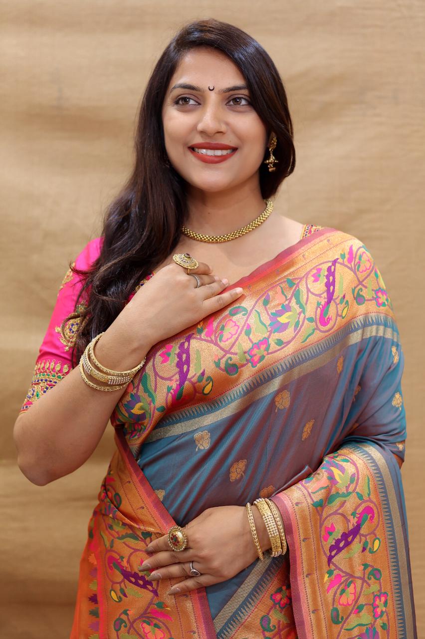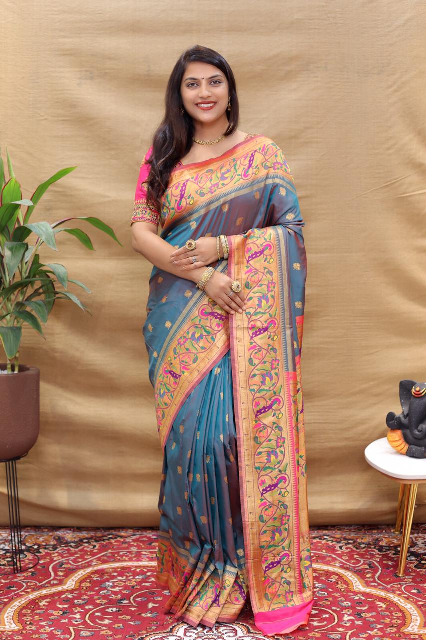 Experience the timeless elegance of Paithani Silk Saree with a stunning blouse piece that complements your style. Crafted meticulously with the finest silk, this saree boasts a luxurious sheen and vibrant hues. Adorned with intricate zari work and traditional motifs, it reflects the artistic heritage of Maharashtra.
