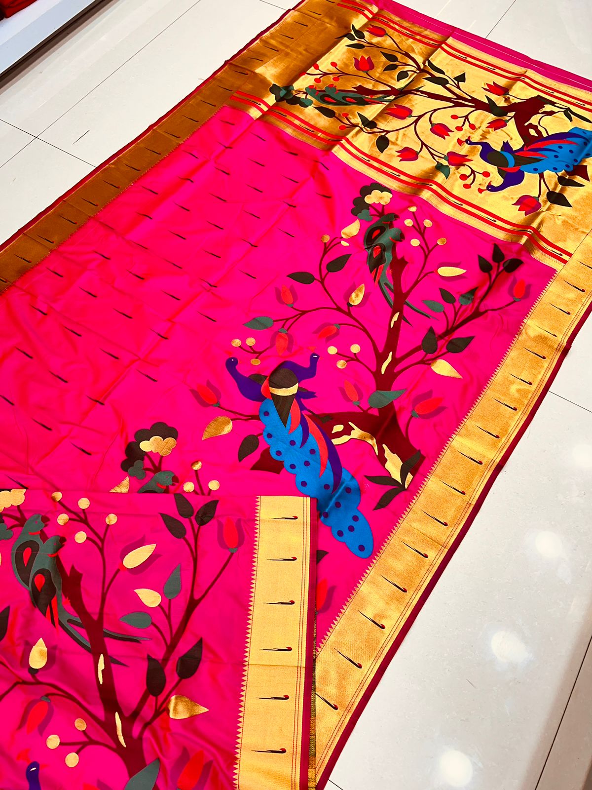 The saree is adorned with intricate motifs inspired by nature, such as peacocks, flowers, and vines. These motifs are meticulously woven into the fabric using vibrant and contrasting colors, creating a mesmerizing visual spectacle. The silk used is of the finest quality, ensuring a regal and comfortable wearing experience.